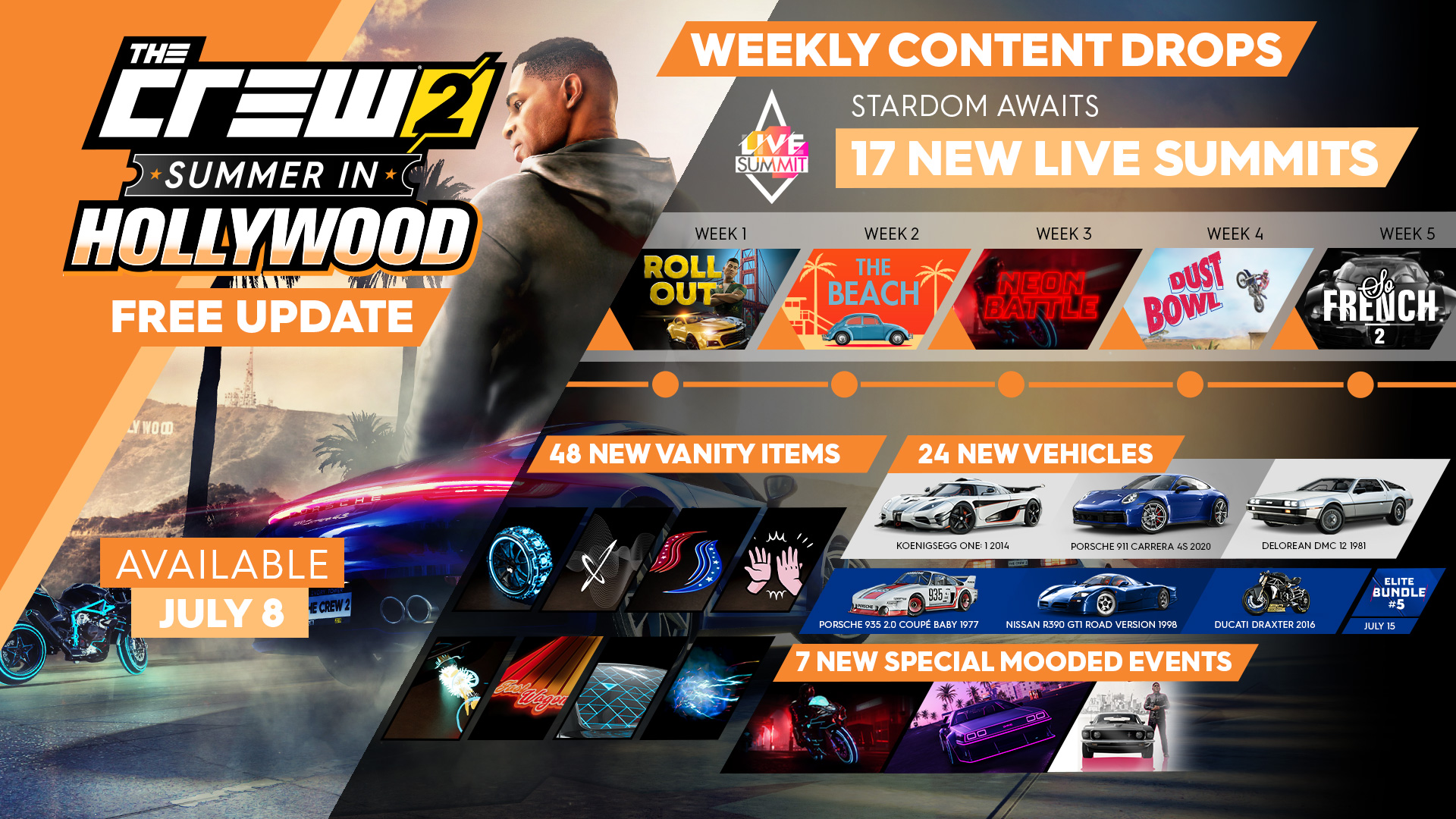 Ubisoft gab heute bekannt, dass The Crew2 Sommer in Hollywood, das sechste kostenlose Update für The Crew 2, ab dem 8. Juli für die PS4 verfügbar sein wird.