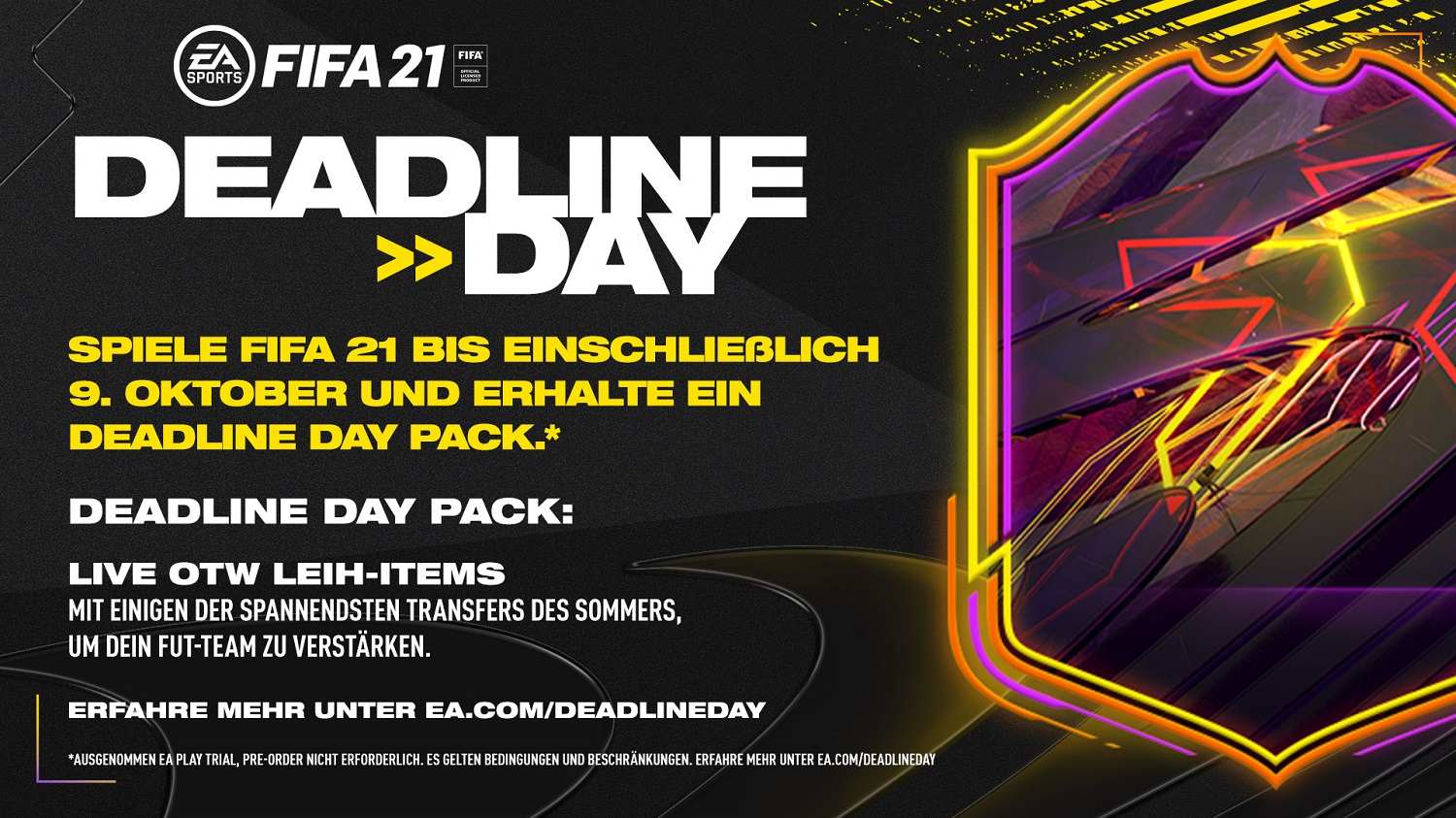 Zum bevorstehenden Release von FIFA 21 feiert Electronic Arts mit dem neuen Deadline Day-Paket alle Fans, die bis zum 10. Oktober 2020 um 08:59 Uhr deutscher Zeit in die Vollversion einsteigen. Dieses Paket enthält neben einem untauschbaren "Team of the Week"-Spieler-Item auch die "FIFA Ultimate Team Ones To Watch Leih-Items" mit einigen der aufregendsten Transfers des Sommers. Alle Einzelheiten sind unter ea.com/deadlineday zu finden.