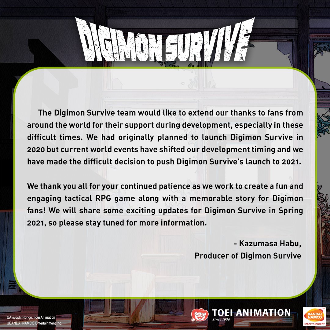 Vor zwei Jahren wurde Digimon Survive angekündigt - ein klassisches JRPG mit 2D Sprites, rundenbasierten Kämpfen und vielen Geprächen im Visual-Novel Stil. Eigentlich sollte der Titel ursprünglich in 2019 im Westen erscheinen, dann 2020 und nun erst im nächsten Jahr. Das kündigte Kazumasa Habu (Produzent des Spiels) in einer Mitteilung an. Als Gründe für die erneute Verschiebung werden ua. die aktuelle Corona-Pandemie und dem damit verbunden Zeitplan bei der Entwicklung.