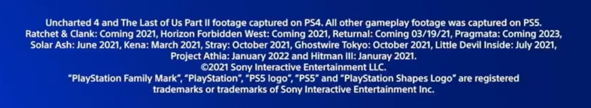 Auf der CES (Consumer Electronics Show) Pressekonferenz von Sony wurden just nicht nur die neuesten Bravia TV-Modelle vorgestellt, sondern auch ein Video mit kommenden PS5 Spielen gezeigt. In einer Fußnote wird auch auf diverse Release-Zeiträume eingegangen. Hier ist der entsprechende Verweis und welche Sachen wir daraus Ableiten können.