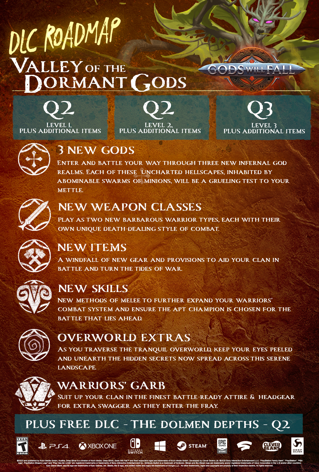 Im zweiten Quartal dürfen sich alle Besitzer des Spiels über ein Geschenk in Form des kostenlosen DLC „Dolmen Depths“ freuen, in dem man eine mysteriöse Unterwelt erforschen und einen seit langer Zeit verschollenen Krieger aus dem Jenseits befreien muss, der sich bei Erfolg der eigenen Truppe anschließt. Dies wird aber kein leichtes Unterfangen, denn in diesem brandneuen, prozedural generierten Dungeon wimmelt es nur so vor grausigen Feinden, die mit aller Macht versuchen, die Toten dort zu behalten, wo sie hingehören