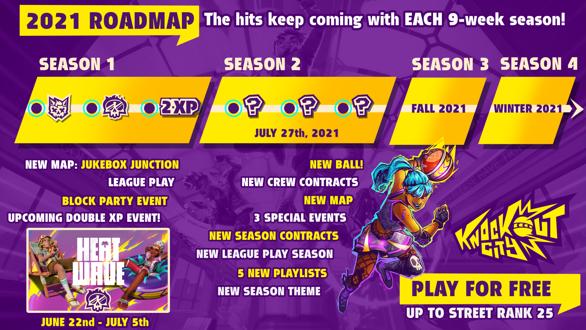 Electronic Arts und die Velan Studios veröffentlichten heute die Roadmap für die Zukunft des teambasierten Dodgeball-Titels Knockout City, der die Inhalte beschreibt, die Spielende bis zum Jahresende erwarten können. Am 27. Juli beginnt die Saison 2 mit einer neuen Karte, einem neuen Spezialball, drei speziellen Events, neuen Saisonverträgen, fünf neuen Playlists sowie einem neuen täglichen Anmeldebonus, der Spielenden an jedem Tag, an dem sie spielen, eine zufällige Belohnung einbringt.