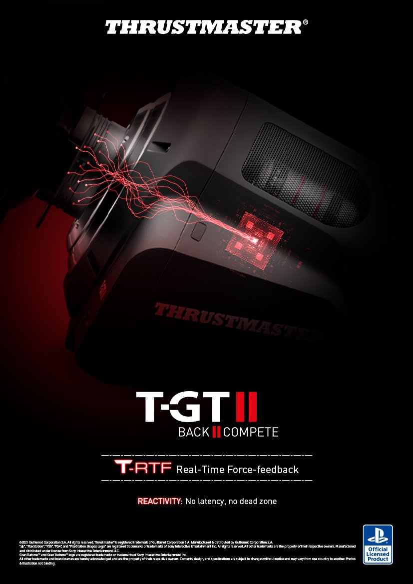 Das T-GT II ist mit Thrustmasters bewährtem bürstenlosen Motor T-40VE ausgestattet, der ein hochpräzises Force Feedback und ein gleichmäßiges Drehmoment während der Rennen liefert. Außerdem verfügt das T-GT II über das beliebte Force-Feedback-System T-DFB (Depth FeedBack / Tiefen-FeedBack) das bereits bei seinem Vorgänger zum Einsatz kam. Diese ausgeprägte Tiefenwahrnehmung auf der Force-Feedback-Achse liefert Präzisionsdaten zwischen 30 Hz und 100 Hz und vermeidet den Informationsverlust, der bei herkömmlichen Force-Feedback-Systemen auftritt.