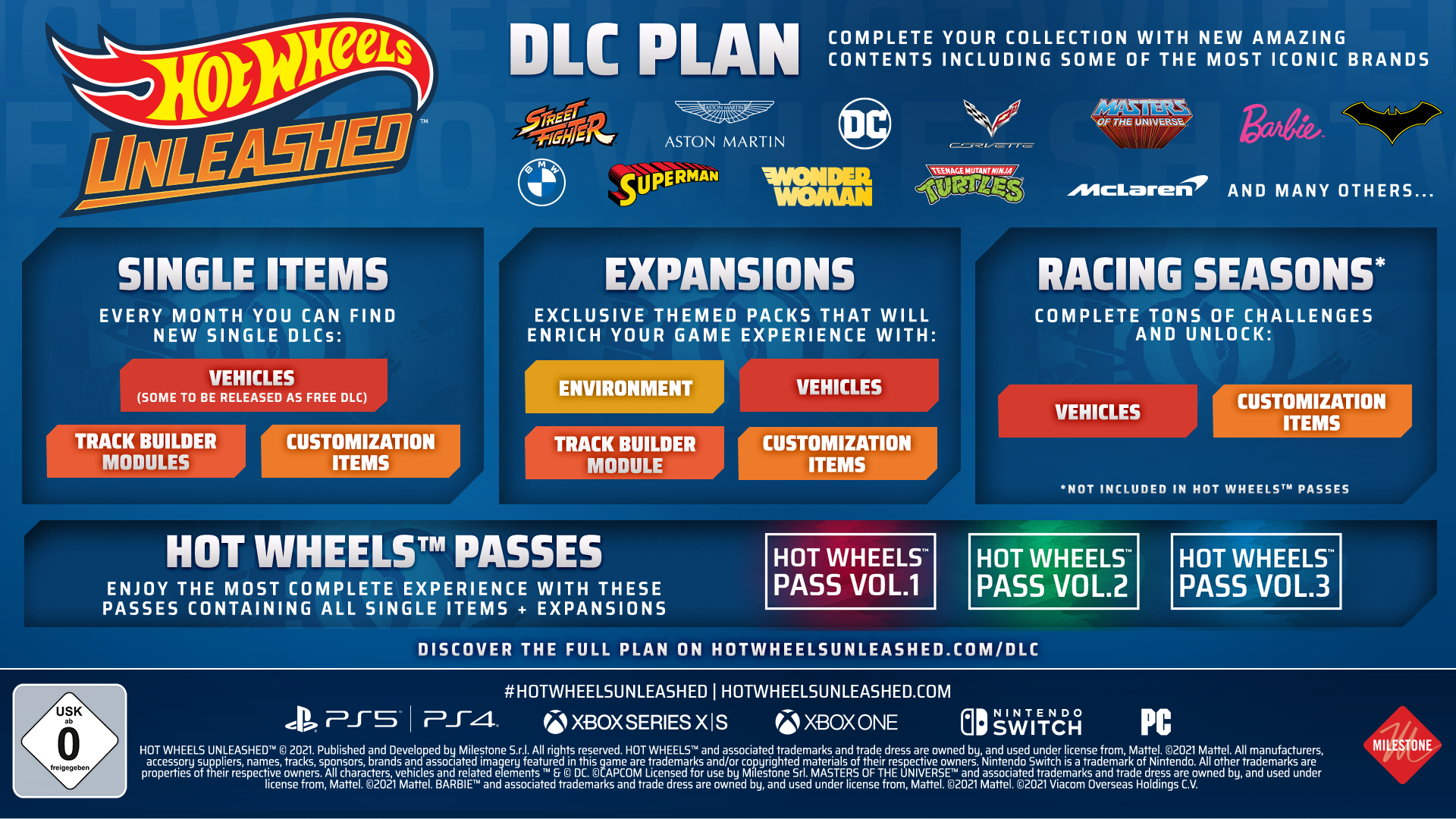 Der Hot Wheels Pass Vol. 1 wird mit der Veröffentlichung des Spiels verfügbar sein und enthält zehn bekannte Marken, darunter Barbie, DC, Street Fighter und Teenage Mutant Ninja Turtles. Zudem sind drei Customization-Packs und drei Module für den Streckenbau im ersten Erweiterungspass enthalten. DC spendiert gar eine Batman-DLC-Erweiterung.