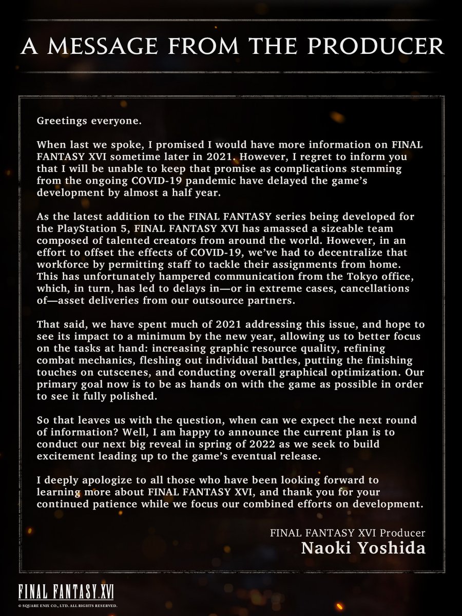 Eigentlich wollte Square Enix noch 2021 Neuigkeiten zu Final Fantasy XVI präsentieren. Doch in einem Statement hat Naoki Yoshida, Producer von Final Fantasy XVI, nun zugegeben das dieses Versprechen nicht eingehalten werden kann. Grund hierfür ist die andauernde Covid-Pandemie welche die Entwicklung um ein halbes Jahr zurückgeworfen hat. Man musste die Mitarbeiter von Zuhause aus arbeiten lassen was zu einigen Umstellungen führte und nicht immer reibungslos geklappt hat.