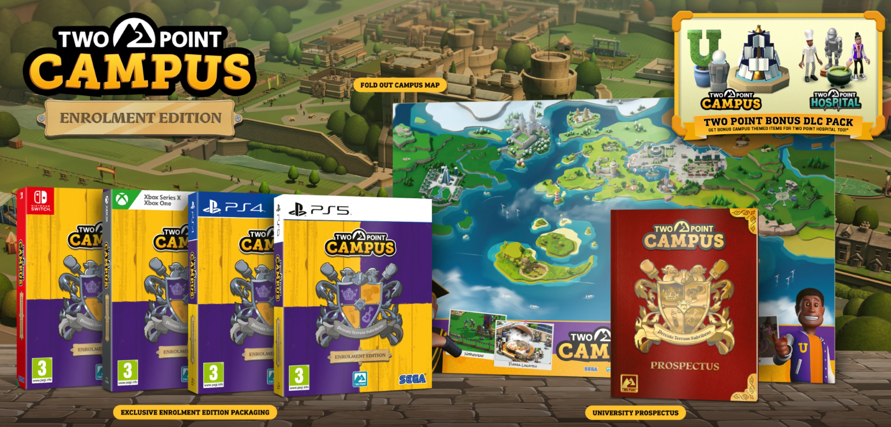 Auf sein Universitätsabenteuer kann man sich bereits jetzt vorbereiten, indem man Two Point Campus jetzt vorbestellt, um einige exklusive Bonusgegenstände im Spiel zu erhalten, die den eigenen Campus zum Start aufpeppen werden. Schmückt euren Garten mit einem U-förmigen Formschnittbusch, stillt den Wissensdurst am Brunnen des Wissens und holt euch eine ganz persönliche Perle der Weisheit. Wer Two Point Hospital besitzt und Two Point Campus vorbestellst, der darf sich über seinen Glückstag freuen, denn Besitzer des Hospitals erhalten einige tolle kostenlose Ingame-Gegenstände für Two Point Hospital, wie eine elegante Varsity-Jacke und eine Rüstung. Wer ein physisches Exemplar von Two Point Campus kauft, erhält die "Enrolment Edition", die eine tolle ausklappbare Campus-Karte, einen schicken Universitätsprospekt und eine exklusive Verpackung mit sich bringt.