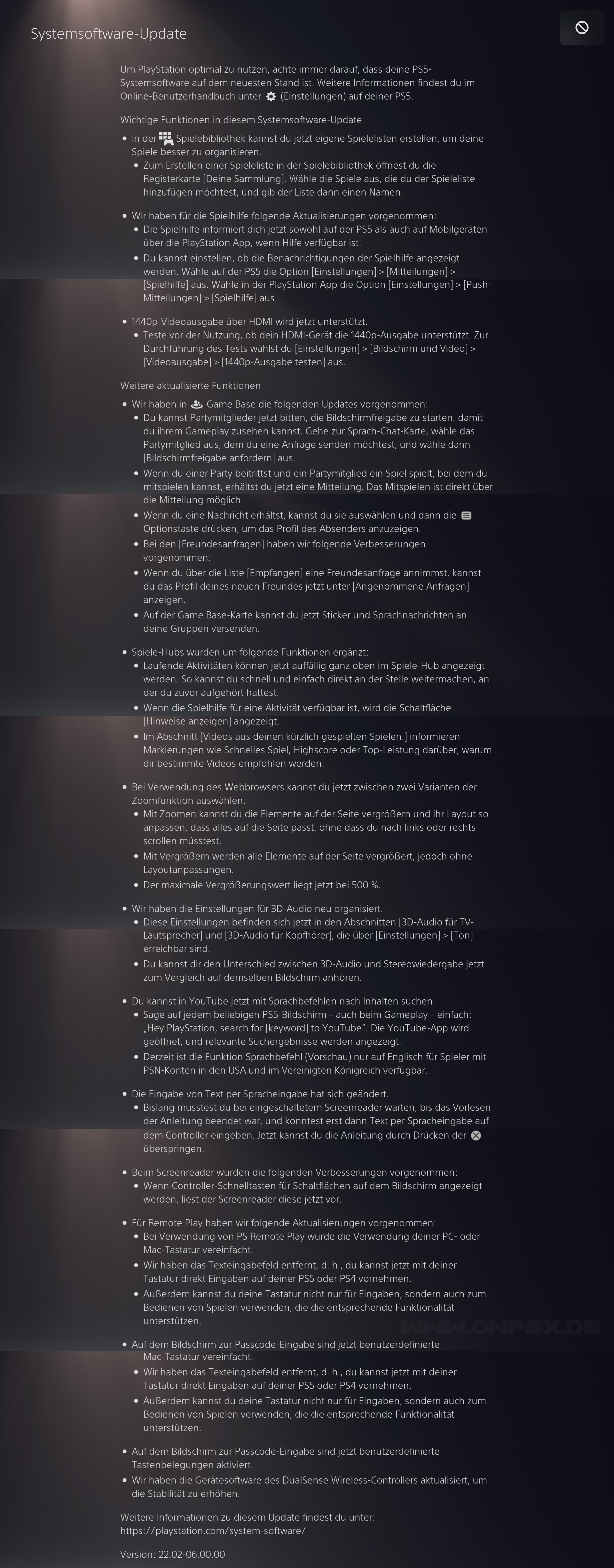 Sony hat ein neues Firmware Update 22.02-06.00.00 (~ 1GB + seperates DualSense Update) für die PS5 veröffentlicht. Das Update befand sich mehrere Wochen zuvor in einer öffentlichen Beta-Phase und bringt zahlreiche Features mit sich.