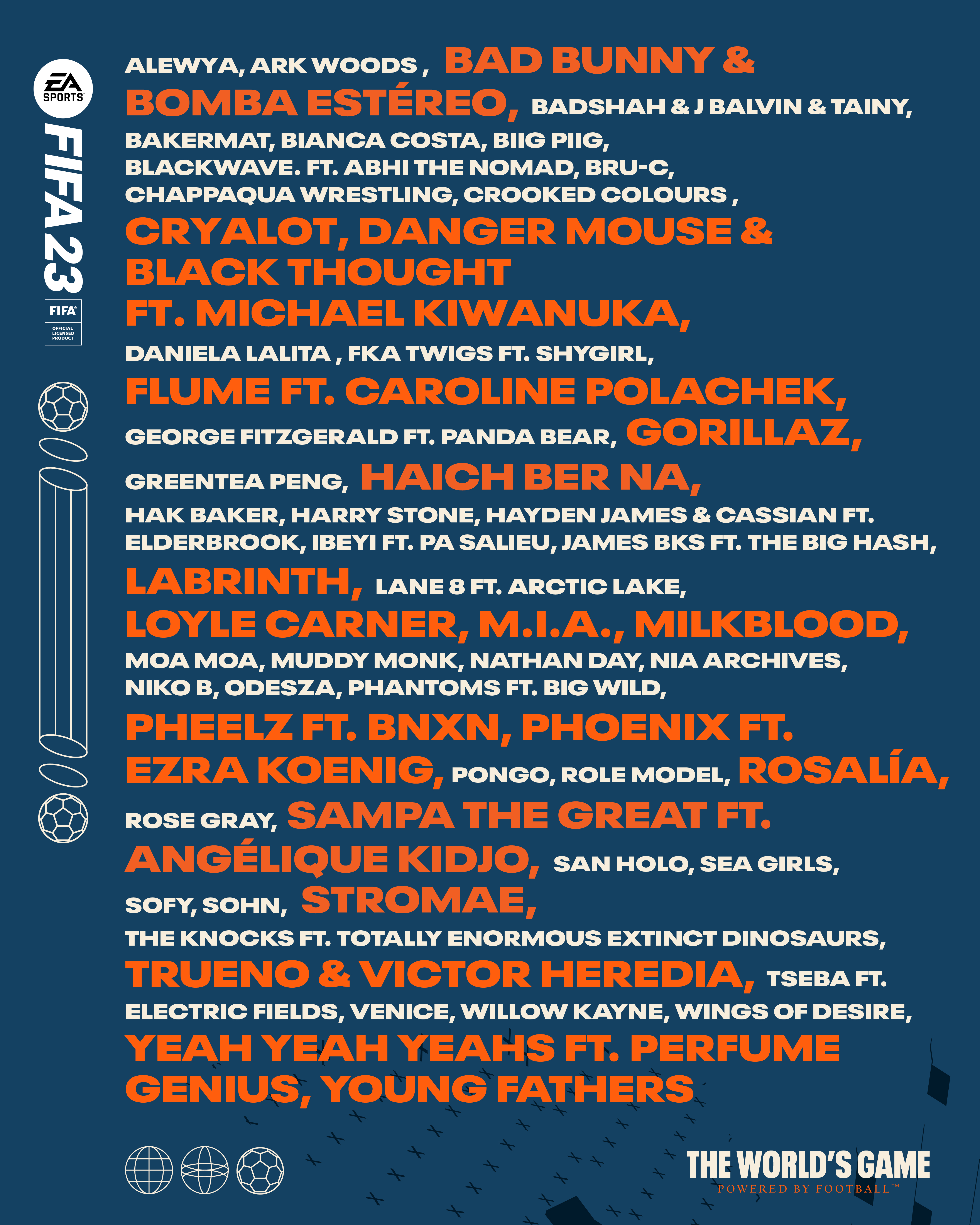 Der Menü-Soundtrack begrüßt die Fans in FIFA 23 mit 57 frischen Melodien von Publikumslieblingen wie FKA Twigs, Flume, Milkblood, Phoenix, Sampa The Great, Odesza und anderen. Die Playlist präsentiert eine enorme Bandbreite an Sounds, vom angolanischen Popstar Pongo bis hin zu den britischen Alternative-Hip-Hop-Stars Gorillaz und darüber hinaus.