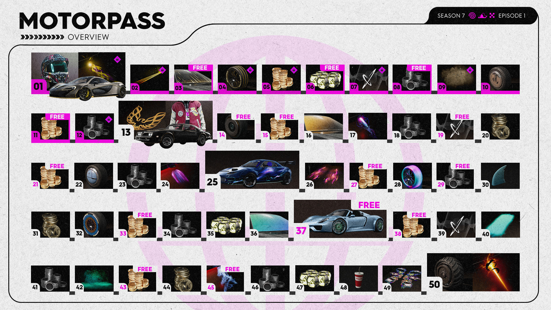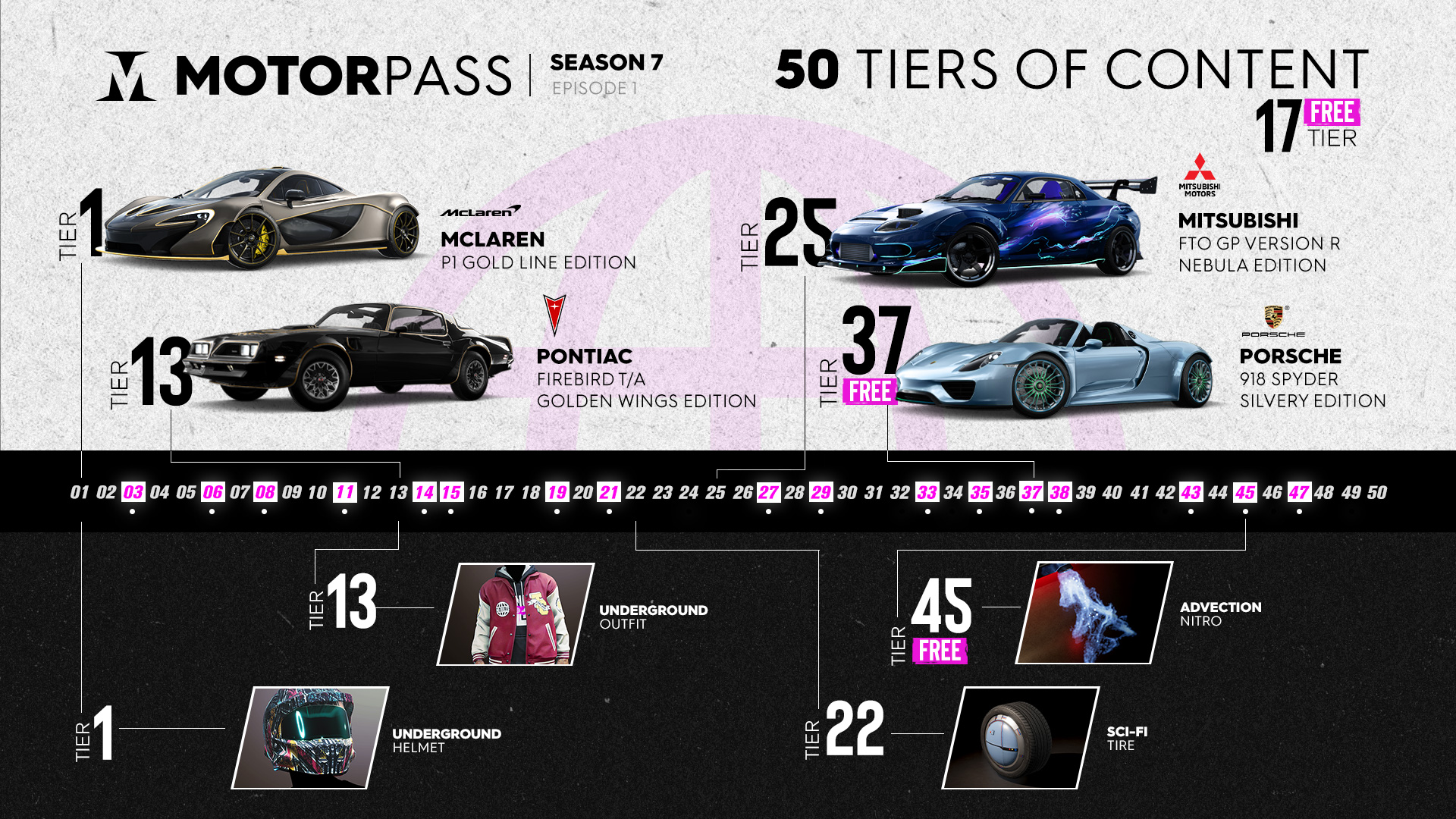 Ein brandneuer Motorpass mit 50 Rängen neuer exklusiver, kostenloser sowie Premium-Belohnungen wird mit Season 7 Episode 1: Into The Storm in das Spiel gebracht. Dazu gehören der McLaren P1 Gold Line Edition (Hypercar), der Pontiac Firebird T/A Golden Wings Edition (Street Race), der Mitsubishi FTO GP Version R Nebula Edition (Street Race), der Porsche 918 Spyder - Silvery Edition (Hypercar) sowie Prestige-Objekte, Outfits, Währungspakete (Crew Credits und Bucks) und vieles mehr.