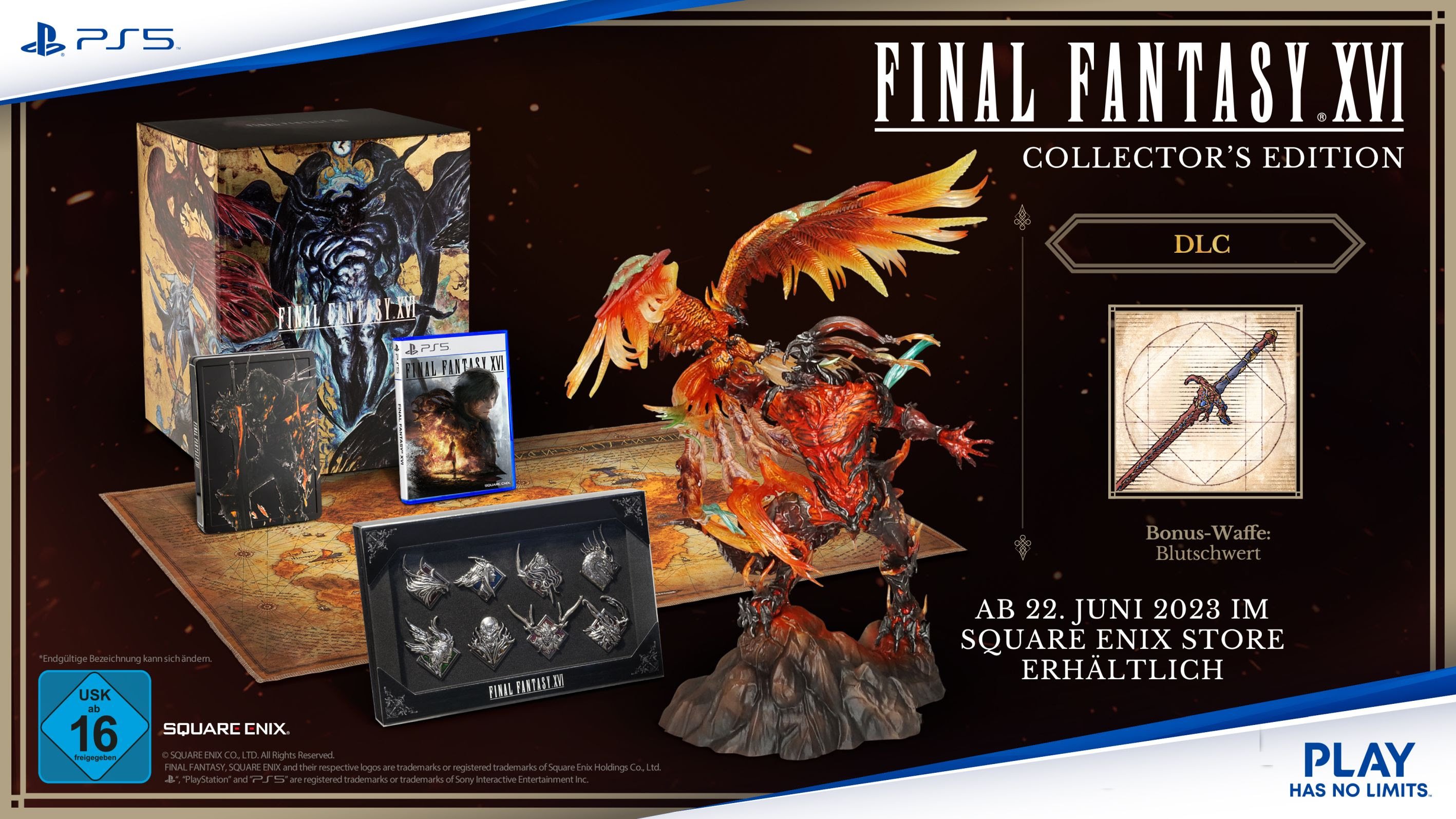 Die Final Fantasy XVI Collector’s Edition kann nur im Square Enix Store vorbestellt werden. Wer die Collector’s Edition im Square Enix Store vorbestellt oder kauft, erhält zudem Folgendes: Digitales Mini-Artbook, Digitaler Mini-Soundtrack und DLC „Lesezwicker (EP-Boost-Accessoire)“.