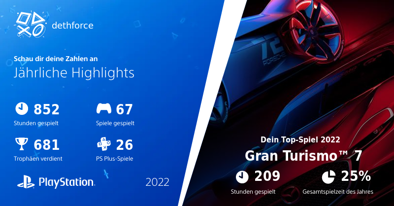 PlayStation hat wieder eine Zusamenfassungs Website online gestellt, auf der euer PSN-Profil synchronisiert wird und ihr seht, wieviel Zeit ihr mit der PlayStation verbracht habt, welche Spiele ihe am meisten gespielt habt und wieviele Trophäen ihr gewonnen habt.