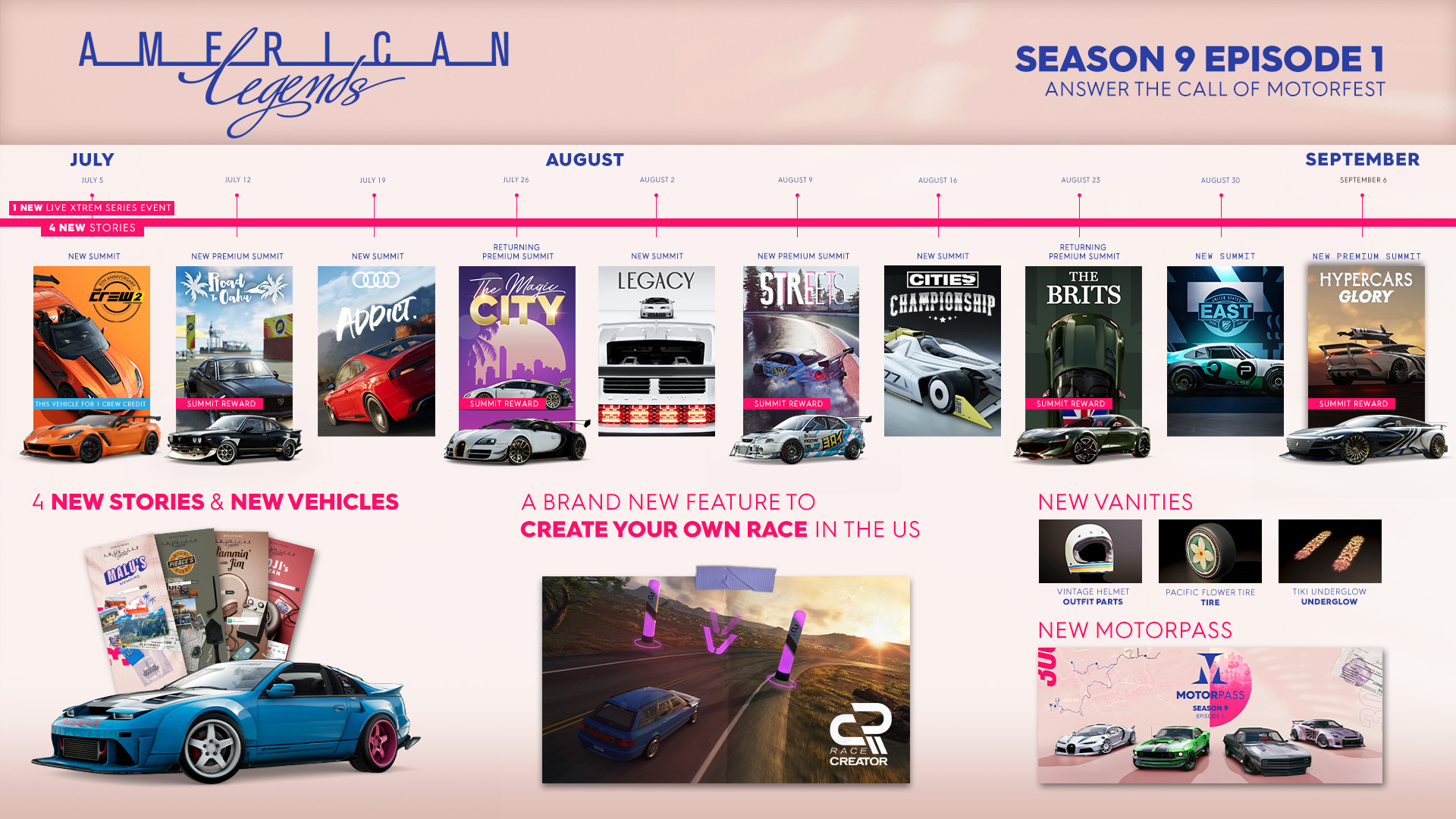 Zum ersten Mal seit Season 5 werden in dieser ersten Episode neue American Legends-Geschichten und -Events eingeführt, die den The Crew 2-Spieler die Möglichkeit geben, auf einer epischen Schatzsuche hinter dem Steuer legendärer Autos wie dem Bugatti Chiron Sport 300+ Divine Edition (Hypercar), dem Ford Mustang Boss 429 Lime Edition (Straßenrennen), dem Chevrolet Camaro RS Ghost Edition (Straßenrennen) oder dem Nissan GT-R Haru Edition (Straßenrennen) durch das Land zu fahren. S9E1 wird auch ein neues Live-Xtrem-Event einführen. Diese Renn-Quests auf dem gesamten US-Festland, und insbesondere das Road to O'ahu-Event mit seinem abschließenden Cinematic, werden neue Details und Hintergrundgeschichten zeigen, die mit dem nächsten Teil der Franchise verbunden sind: The Crew Motorfest.