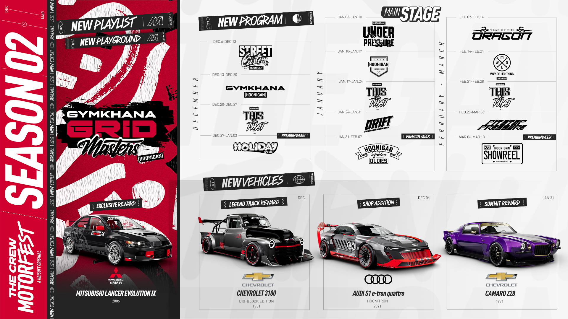 Ubisoft kündigte den Start der zweiten Saison von The Crew Motorfest an, die neue Inhalte präsentiert und in Zusammenarbeit mit der renommierten Motorsportmarke Hoonigan entwickelt wurde. Als Teil dieser Partnerschaft wurde ein von Gymkhana inspirierter Spielplatz auf der Karte des Spiels hinzugefügt, außerdem neue Herausforderungen, neue Rennen und vieles mehr. Insgesamt bringt Season 2 im Laufe von 14 Themenwochen 24 neue Fahrzeuge, darunter kultige Modelle wie den Mitsubishi Lancer Evo IX oder den Lamborghini SC20.