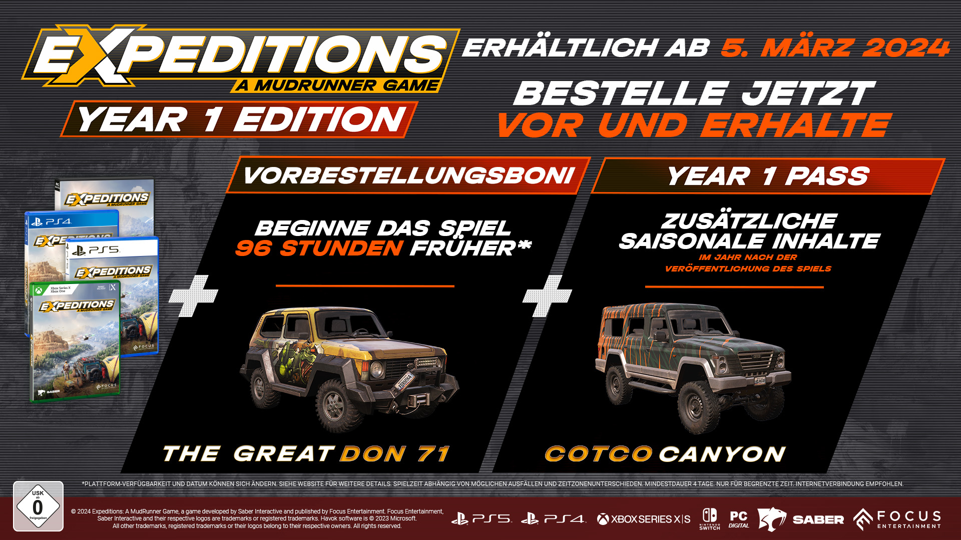 Bestellt jetzt die Supreme Edition, Year 1 Edition oder Standard Edition von Expeditions: A MudRunner Game vor und erhaltet exklusive Inhalte. Mit den Supreme und Year 1 Editionen erhält man außerdem 96 Stunden vor Veröffentlichung des Spiels einen Vorabzugang! Physische Versionen der Standard Edition können ebenfalls in ausgewählten Geschäften vorbestellt werden.