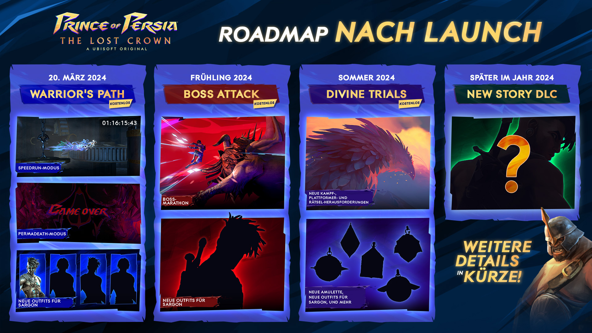 Das erste Titel-Update mit dem Namen Warrior's Path wird am 20. März verfügbar sein und bringt einen Speedrun-Modus, einen Permadeath-Modus und vier neue Outfits für Sargon. Dieser Inhalt wird für alle Spieler, die Prince of Persia: The Lost Crown bereits besitzen, kostenlos sein und ist nur der erste Teil einer Serie.