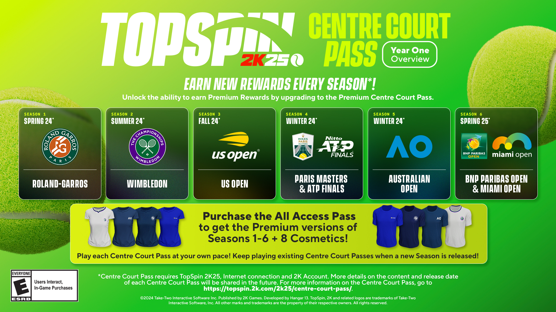 Durch den Kauf des All Access Pass sichern sich die Spieler alle sechs Premium Centre Court Passes für das erste Jahr sowie vier zusätzliche Kosmetikobjekte: je ein T-Shirt mit dem Roland-Garros-Logo, dem Wimbledon-Logo, dem Logo der US Open sowie dem Logo der Australian Open, mit denen sie ihrem Grand Slam-Spirit Ausdruck verleihen können. Der TopSpin 2K25-All Access Pass ist in der TopSpin 2K25 Grand Slam Edition enthalten und kann auch separat erworben werden.