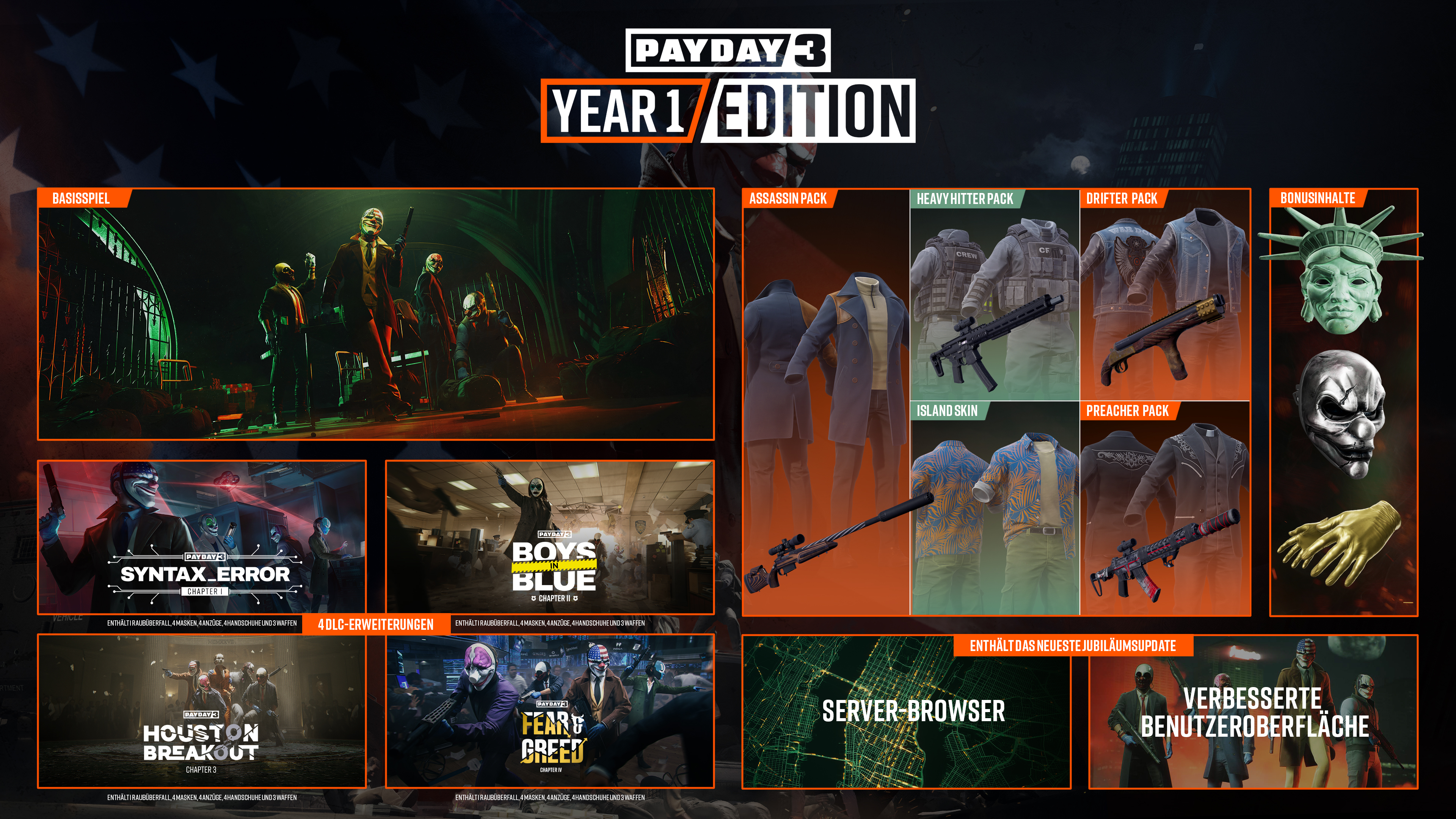 Vollgepackt mit Inhalten, neuen Features und von der Community gewünschten Verbesserungen, wird dieses umfangreiche Update dafür sorgen, dass der nächste Raubzug reibungslos abläuft. Darüber hinaus bringt Payday 3 die Year 1 Edition und den Year 1 Pass auf den Markt - die All-Access-Tickets für alle, die die Kunst des Raubens meistern wollen.