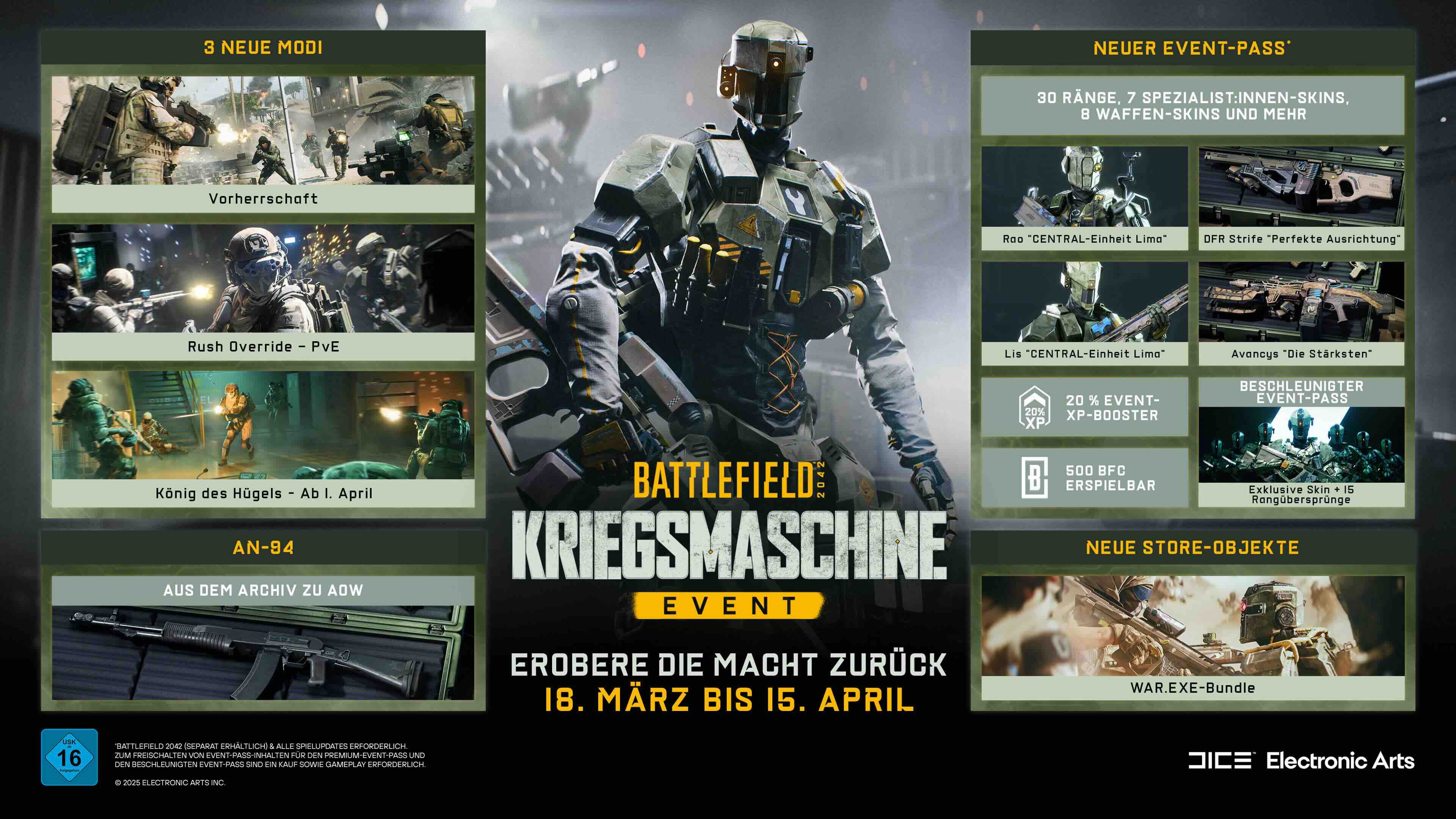 Electronic Arts startete gestern das neue Event “Kriegsmaschine” für Battlefield 2042, welches bis zum 15. April zahlreiche neue Inhalte ins Spiel bringt, darunter kosmetische Objekte, befristete Modi, neue Belohnungen und die Rückkehr einer klassischen Battlefield-Waffe in All-Out-Warfare: das AN-94, das während des Events freigeschaltet werden kann.
