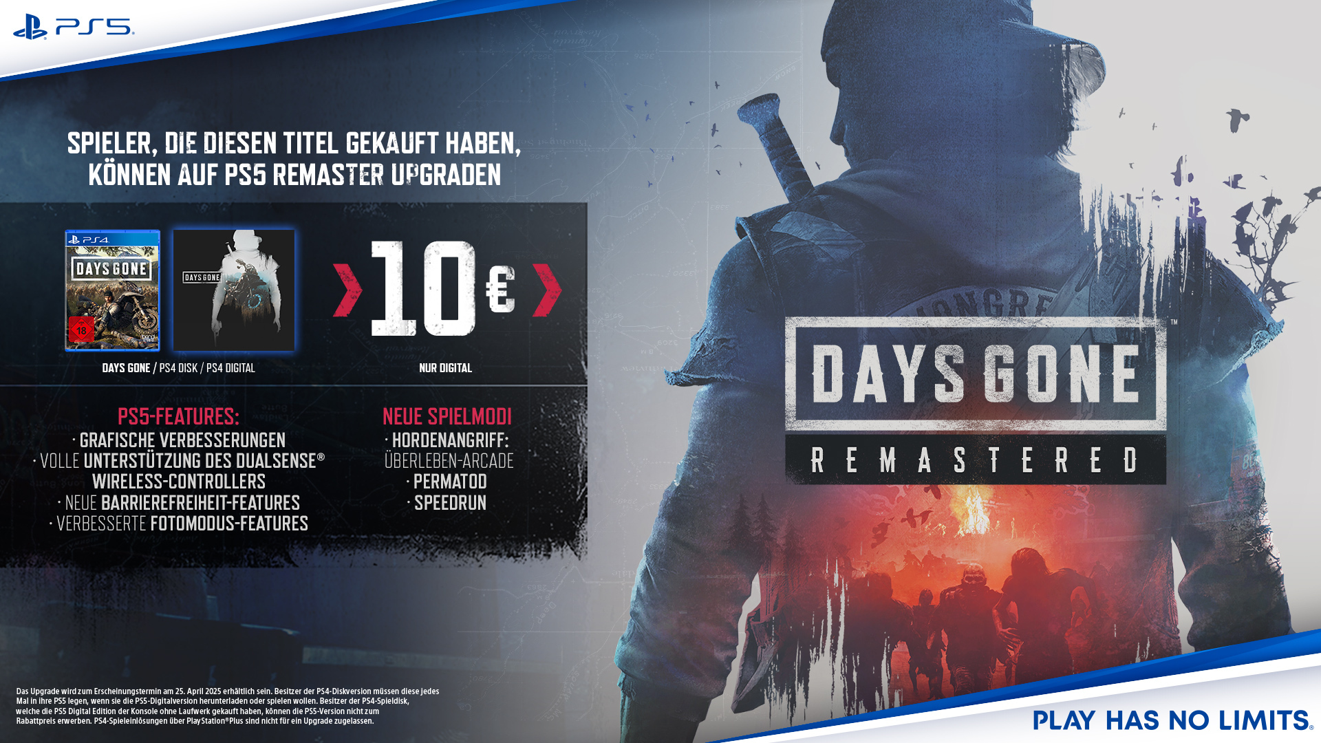 Hordenangriff ist in Days Gone: Remastered für PS5 inkludiert. Das Spiel kann ab sofort im PlayStation Store vorbestellt werden. Spieler, die Days Gone für die PS4 gekauft haben, können für nur 10€ ein Upgrade auf Days Gone: Remastered mit allen neuen Inhalten und Features durchführen.