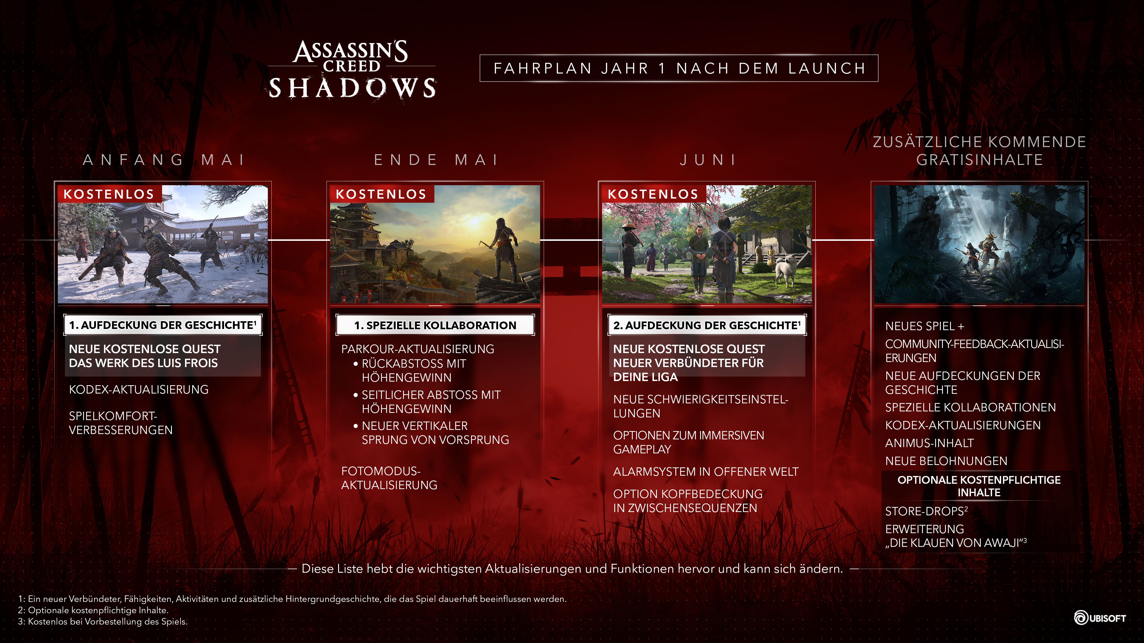 Ubisoft hat seine Year 1 Post-Launch-Roadmap von Assassin`s Creed Shadows vorgestellt. Diese zeigt eine Reihe von regelmäßigen Updates, die das Live-Spielerlebnis im Laufe der Zeit erweitern werden. Diese Updates werden kostenlose Inhalte für alle Spieler enthalten, darunter zusätzliche Story-Inhalte, besondere Kooperationen, Updates basierend auf Community-Feedback, neue Belohnungen und mehr.