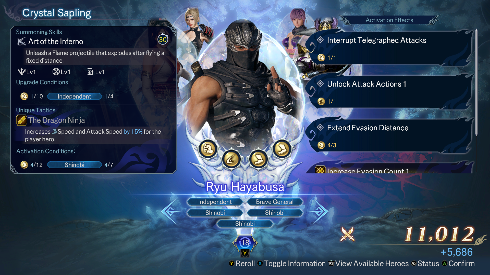 Das kostenlose Update fügt Meister-Ninja Ryu Hayabusa und Ayane, Rachel und Momiji als spielbare und beschwörbare Helden hinzu. Jeder Ninja besitzt seine eigenen einzigartigen Fähigkeiten, wie Ryu Hayabusas „Einsamer Meister-Ninja“ oder Ayanes „Mugen-Tenshin-Stil“, die es dem Spieler ermöglichen, die Geschwindigkeit oder den Angriff der Helden zu erhöhen, je nachdem mit welchen Emblemen sie ausgestattet sind. Durch die Kombination der Fähigkeiten der Charaktere können die Spieler neue Strategien entwickeln und neue Formationen bilden, die so schnell und tödlich wie Ninjas sind.
