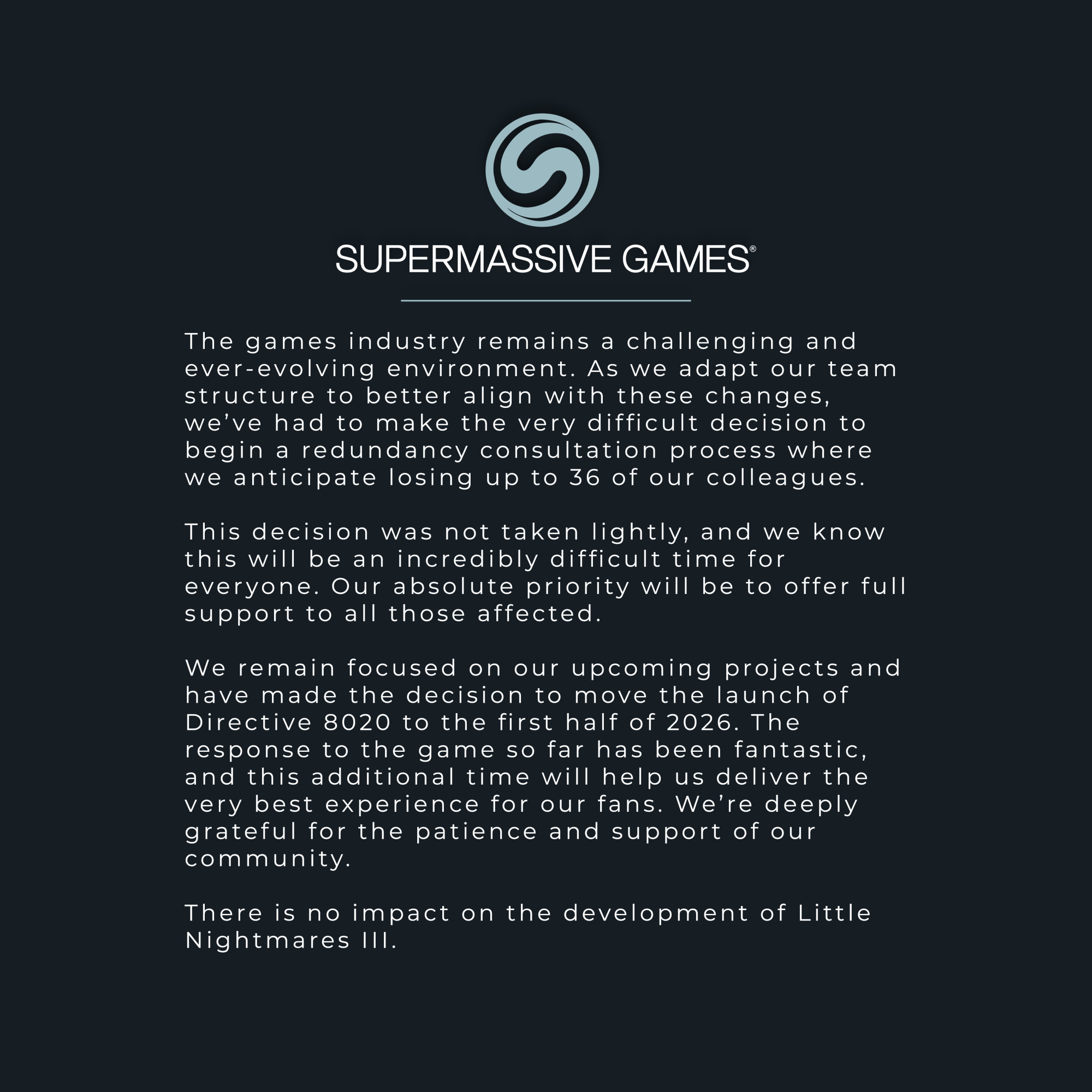 Via X hat Supermassive Games verkündet, dass der Entwickler 36 Stellen abbauen wird. Begründet wird dies mit einem herausfordernden und sich ständig weiterentwickelndes Umfeld. Deshalb muss die Teamstruktur an diese Veränderungen angepasst werden.