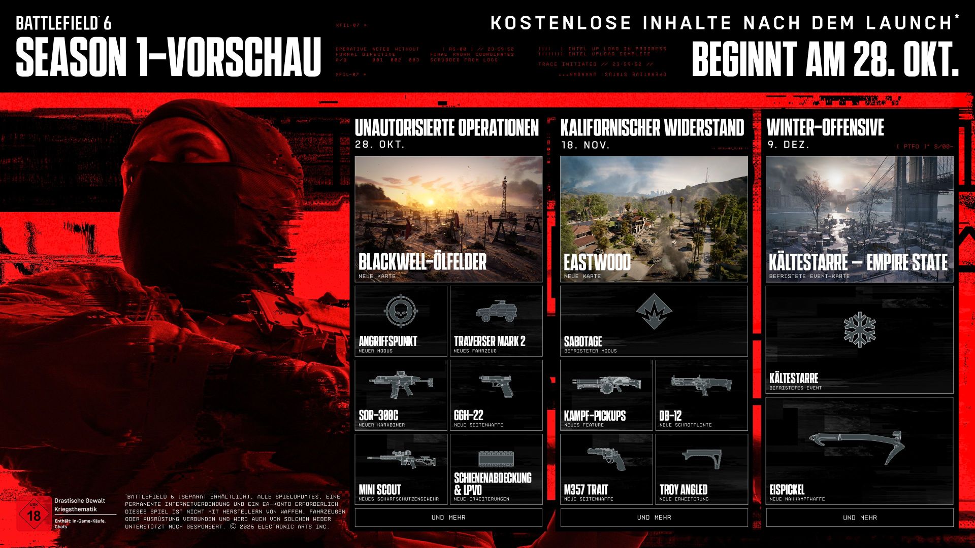 Die Battlefield Studios stellten die Roadmap für die erste Season von Battlefield 6 vor – ein umfassendes, kostenloses Update. Ab dem 28. Oktober erscheint monatlich eine Vielzahl neuer Inhalte.
