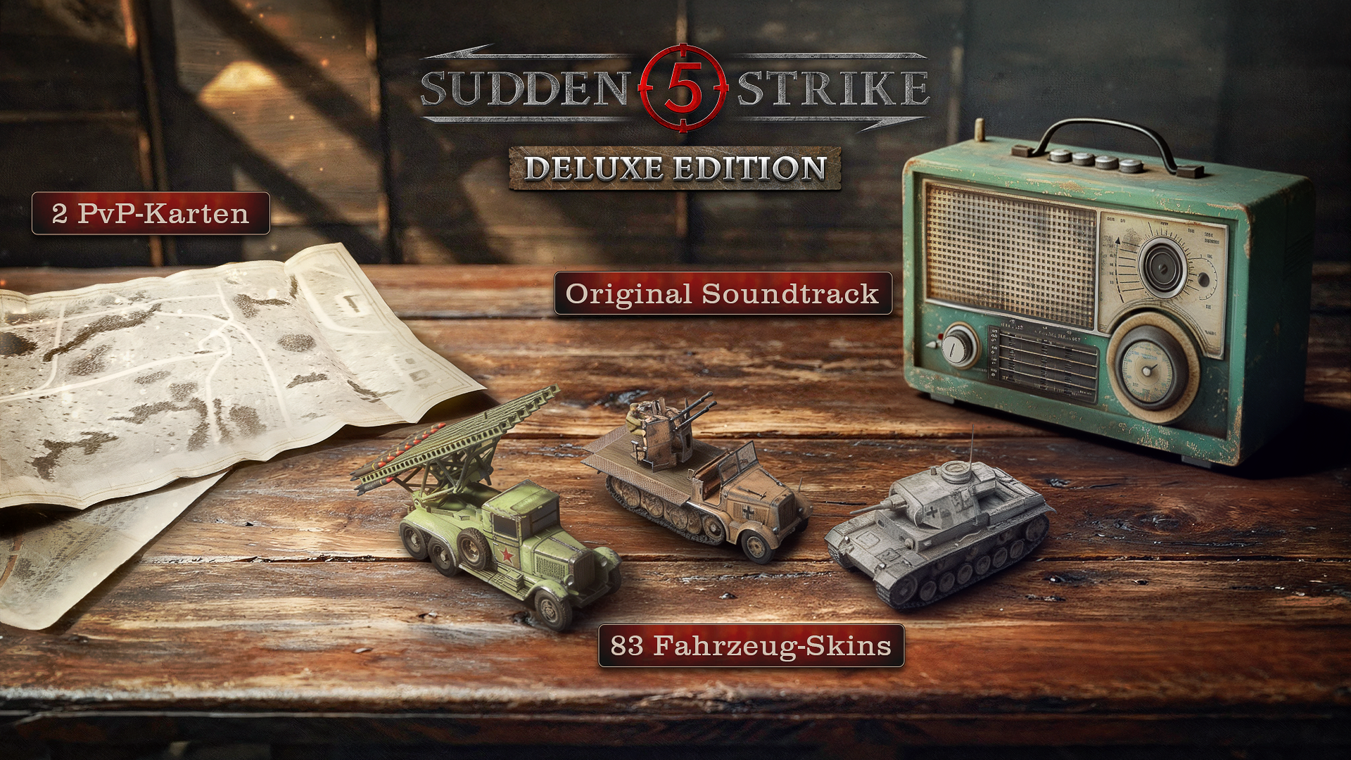 Die Sudden Strike 5 – Deluxe Edition bietet eine Vielzahl zusätzlicher Inhalte, darunter zwei exklusive PvP-Kartenvarianten – „Piazza del Mercato (Nacht)” und „Weißrussische Felder (Winter)” – sowie sechs exklusive Skin-Pakete mit über 80 einzigartigen Fahrzeug-Tarnlackierungen. Ebenfalls in der Deluxe Edition enthalten ist der Original-Soundtrack, der orchestrale Kampfszenen mit atmosphärischen Klangkulissen kombiniert und so für ein besonders immersives Spielerlebnis sorgt. Darüber hinaus erhalten Vorbesteller der Deluxe Edition die Möglichkeit, das Schlachtfeld bereits 72 Stunden vor dem offiziellen Release zu stürmen.