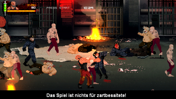 Spielerisch orientiert sich Mother Russia Bleeds an Spielen, wie Streets of Rage. Man betrachtet das Spielgeschehen also aus der Seitenperspektive und bewegt seinen 2D-Charakter über die Straßen und verprügelt dabei diverse Gegner. Dazu stehen euch Tritte, Schläge und Griffe zur Verfügung und wenn Gegner Waffen fallen lassen, könnt ihr diese aufnehmen und selber nutzen. Kleinere Combos gibt es auch, aber die Abhängigkeit bringt ein weiteres Spielelement mit herein. Denn ihr habt eine Spritze mit drei Ampullen und ihr könnt die Spritze nun dazu nutzen, um euch zu heilen oder stärker zu machen. Wenn euch die Ampullen aber ausgehen, könnt ihr sie zum Glück bei besiegten Gegnern wieder auffüllen, da sie natürlich voll mit den Medikamenten sind. Das Spiel ist übrigens für vier Spieler ausgelegt und wird dann wunderbar chaotisch. Dank Couch-Coop dürfte es zu spaßigen Streitereien führen, vor allem wenn das Friendly Fire angeschaltet ist. Die Mehrspielerkomponente soll aber nicht nur für Lacher und Streitigkeiten sorgen, sondern ist auch taktisch nutzbar. Zum Beispiel Bisskämpfe profitieren extrem von eingespielten Teams, da diese meist nicht durch simples Buttondrücken zu besiegen sind. Man muss ihre Angriffsmuster lernen und entsprechend umgehen. Beispielsweise kann ein Boss nicht von vorne angegriffen werden und die Entwickler wollen jeden Boss zu einer einzigartigen Herausforderung machen. Aktuell ist der Coop übrigens entweder lokal oder online spielbar, aber man möchte später auch gemischte Sessions mit z.B. zwei lokalen und zwei online Spielern ermöglichen.