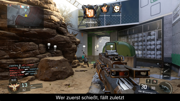 Der erste große Trailer zu Call of Duty: Black Ops 3 zeigte Soldaten in einer nicht allzu fernen Zukunft, die dank Exoskeletten an Wänden herumliefen, höher springen konnten und zahlreiche weitere Fähigkeiten hatten. Im ersten Moment könnte man meinen, dass man es hier mit einem indirekten Nachfolger zu Advanced Warfare zu tun hätte, doch dem ist nicht so, was vor allem zwei Dingen geschuldet ist. Zum einen ist das Spiel deutlich langsamer als Advanced Warfare. Während dort alle im Vollsprint umherliefen und dank Doppelsprung in hoher Geschwindigkeit die vertikale erklimmen konnten, geht es in Black Ops 3 deutlich gemächlicher zu. Trotz der ganzen Fähigkeiten spielt es sich relativ klassisch und die meisten Leute bleiben auch am Boden und suchen etwas Deckung in der Nähe von Kisten oder Wänden. Wer wie in Advanced Warfare einfach mitten in den offeneren Gebieten herumläuft, kann sich auch direkt auf den Respawn einstellen.