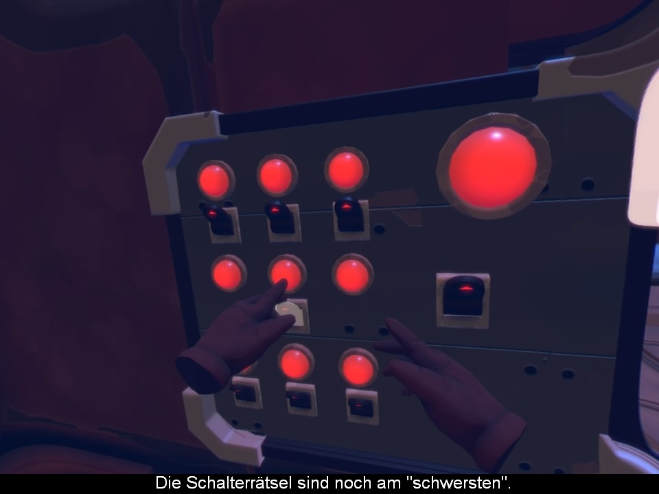 Bis man seinen Vater wieder den Arm nehmen kann, muss man aber einige Puzzle lösen, wobei diese (vorrangig) Schalterrätsel ziemlich einfach gestrickt sind. Meist läuft es darauf hinaus, dass auf einem Schaltpult alle Lämpchen grün leuchten müssen, oder man mittels Drehrädern den Wasserfluss richtig umleiten muss. Da man kein Inventar hat, fallen zudem Kombinationsaufgaben und suche Gegenstand A für Schalter B Rätsel weg. Des Weiteren gilt es mittels Seilwinden den richtigen Weg zu finden, oder Roboter auf den richtigen Schalter zu schicken. Wirklich harte Brocken wie z.B. in “The Witness” sucht man hier leider vergebens und vor allem die Seilwinden werden arg überstrapaziert. Ganz Nebenbei ist “Wayward Sky” sehr linear gehalten und abseits gibt es nur wenig Geheimnisse zu entdecken. Zwar kann man Windspiele und Bauteile für Roboter entdecken, doch sind diese leicht zu finden, wenn man sich nur ein wenig die Gegend anschaut. Beim ersten Durchgang, der mit reichlich vier Stunden recht übersichtlich ist, verpasste ich so nur zwei Items, welche durch die Levelanwahl nachträglich leicht nachgeholt werden können. Dafür ist die Immersion sehr cool, wenn man mittels “Händen” an den ganzen Rädchen und Knöpfchen rumfummelt, oder Gegner mit einem Wasserschlauch abkühlt.