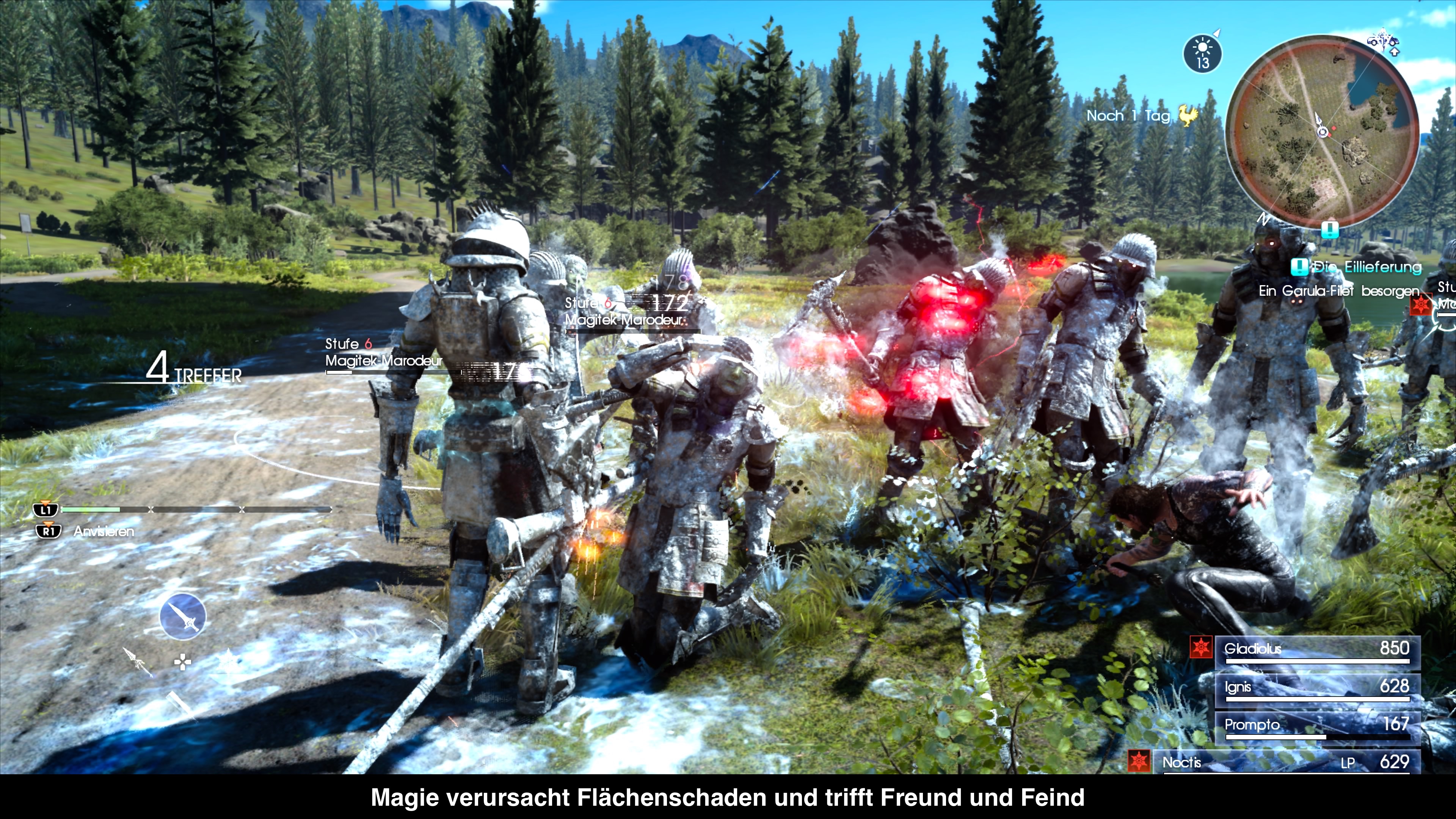 Statt eines rundenbasierten Kampfsystems wie in früheren Spielen, orientiert sich Final Fantasy XV eher an Spielen, wie Devil May Cry. Es geht also sehr actionreichen zu. Dazu gibt es im Kern zwei wichtige Tasten. Die Quadrat-Taste ist zum Blocken bzw. Ausweichen da. Man kann sie gedrückt halten, um Angriffen auszuweichen, wobei dies MP verbraucht. Die zweite Taste ist die Kreis-Taste. Hiermit kann man angreifen und wer möchte kann die Taste durchgehend drücken, um auch durchgehend anzugreifen. In Verbindung mit dem Analogstick kann man so ein paar unterschiedliche Angriffe ausführen, die sich zu Combos aneinander reihen lassen. Ansonsten kann man in der Combo die Waffe wechseln oder sich zu Gegnern oder höher gelegenen Punkten warpen, um dort seine HP und MP aufzufrischen. Bis hierhin klingt es ganz gut, doch so action-getriebene Spiele leben von einem guten Lock-On und Kamerasystem. Beides bietet Final Fantasy XV leider nicht. Denn das Lock-On verliert ständig seinen Lock, sobald man niedergeworfen wird oder sonst etwas passiert. Letztlich verzichtet man irgendwann darauf, weil es eh gleich wieder abgeschaltet wird vom Spiel. Außerdem funktioniert der Wechsel zwischen den anvisierten Gegner eher schlecht als recht. Wirklich schlimm ist jedoch die Kamera. So wird das Spielgeschehen ständig von Büschen und Bäumen in der Welt verdeckt und in etwas engeren Dungeons spielt die Kamera völlig verrückt. Später im Spiel gibt es einen Kampf, der ziemlich episch sein soll, durch die Kamera aber einfach chaotisch wird. Das gilt aber für die meisten Kämpfe, vor allem wenn mehrere Gegner gleichzeitig gegen euch kämpfen. Problem hierbei ist das man den Gegner zum Teil gar nicht anmerkt, dass sie nun zum Angriff ausholen. Da wackelt ein Bison schon mal mit dem Kopf und man selbst liegt tot auf dem Boden. Viel mehr brauchen die Gegner nicht, um euch anzugreifen.