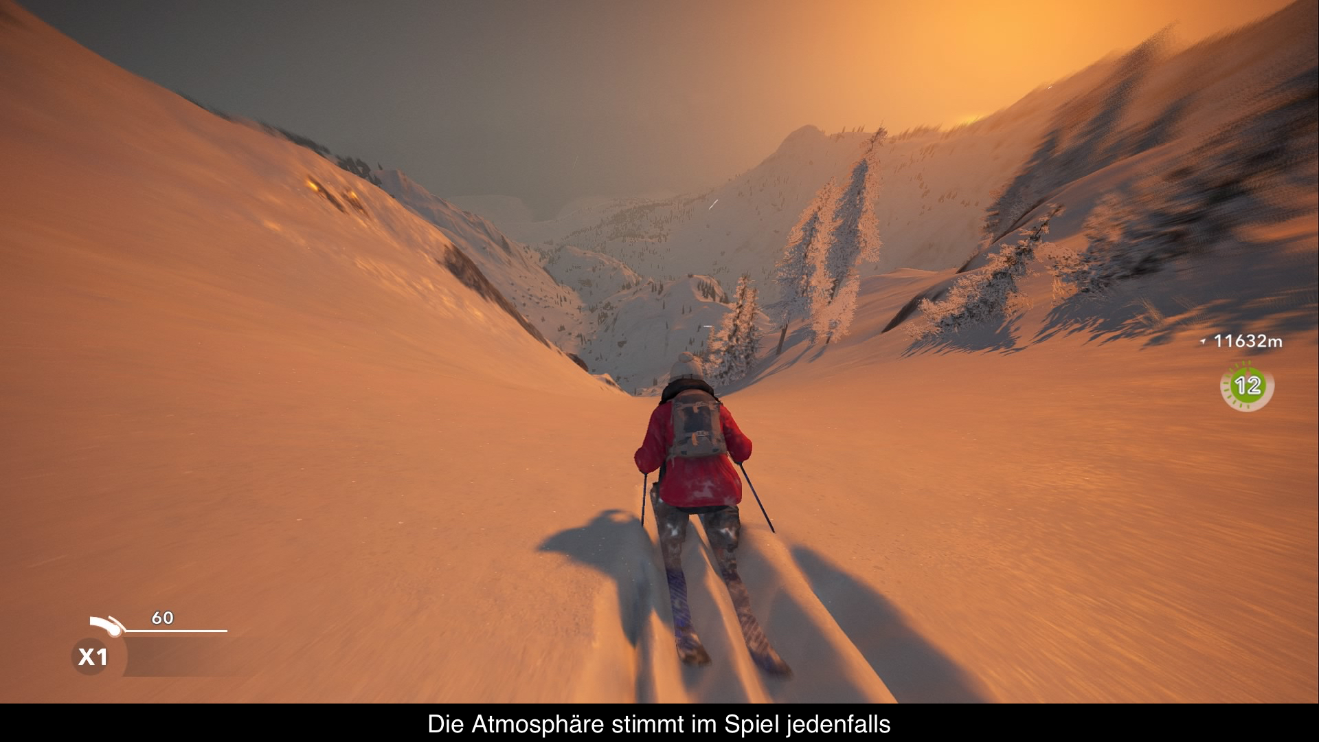 Interessant wird es, wo den Entwicklern freie Hand gelassen wurde. EineBergregionist frei erfunden. Hier findet man die meiste Abwechslung und jede Menge Kreativität die bei der Abfahrt zum Experimentieren einladen. Mit 30fps stürzt man sich die Hänge hinunter und das in 1080p. Rucklersind so gut wie keine Vorhanden, nur wenn Online etwas schnell abgefragt wird. Auch Pop-Upssind in dieser Welt eine Seltenheit. Bei der rasanten Abfahrt erwarten einen keine bösen Überraschungen. Grafisch kann man die teilweise kantigen Schatten ankreiden, welche aber wieder durch die hervorragende Licht-Komposition wett gemacht wird. Die Bergstimmungwurde zu jeder Tageszeit gut eingefangen und macht jede Abfahrt einzigartig, wenn die Sonne durch die Bäume glitzert oder sich über einen Berg erhebt. Ein Erlebnis das vom Gipfel bis ins Tal ohne Ladezeitenauskommt. Einzig der Pro Support fällt mangelhaft aus. Bis auf eine bessere Bildrategibt es hier nichts, wobei nicht einmal 60fps erreicht werden.Akustisch wurde die Bergweltauch sehr realitätsnah eingefangen. Es fängt beim Knirschen des Schnees an und endet beim Summen der Starkstromleitung. Man hört Tiere, den Wind pfeifen, den ein oder anderen Helikopter fliegen oder in der Ferne den Sturz eines anderen Fahrers. Die Abmischung ist hier dynamisch. Fährt man schneller wechselt das Spiel zur schnelleren Hintergrundmusik, bleibt man stehen klingt diese aus, bis man nur mehr die Umgebungsgeräusche wahrnimmt.