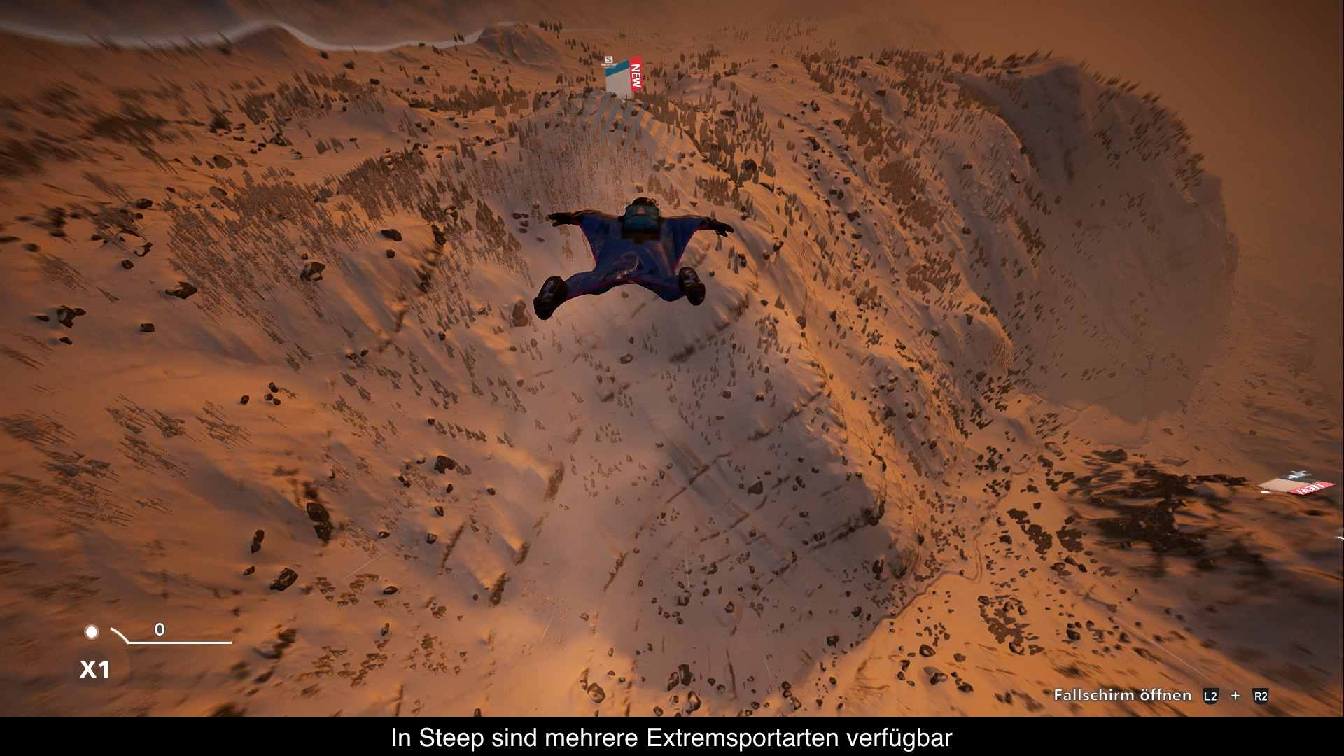 Mag sein, dass jetzt so mancher an dieTheaterweltdenkt, doch hier sind die zahlreichen Ski undSnowboardsgemeint.Steepbietet ganze fünf Fortbewegungsmöglichkeiten in den Bergen, sechs wenn man den Helikopter, welcher einem zum Startpunkt bring, mitrechnet. Um einen Hang zu bezwingen stehen dem Spieler Ski wie auch einSnowboardzur Auswahl. Die Ski sind wesentlich wendiger und schneller, haben aber Nachteile bei der Stabilität. DasSnowboardhingegen ist langsamer, aber besser geeignet um Tricks sicher zu landen. Die Lüfte erkundet man mit einemWingsuitoder demParagleiter. Wer selber gerne durch die Welt wandert, kann diese auch zu Fuß erkunden, sehr langsam und bis auf die Landschaft sehr unspektakulär. Gewechselt wird über einSchnellauswahlrad. Leider ist es nicht möglich in mitten der Bewegung zu wechseln. Man muss still stehen um Aktionen durchzuführen. Ein kleines Manko, wenn man verschiedene Sportarten zum ultimativen Stunt verbinden will. Diese Einschränkung liegt vor allem daran, dass man einen realistischeren Zugang gewählt hat. Vom realistischen Zugang bei den Tricks hat man sich mit dem Update 1.03 verabschiedet. Das kompletteTricksystemwurde überarbeitet, was dieCommunityetwas spaltete. Benötigte man vorher mehr Timing, kann man jetzt schon vor dem Absprung festlegen in welche Richtung man sich drehen will. Dies ermöglicht nun etwas spektakuläre Tricks als es vorher möglich war. So manchen stört es, macht aber Abfahrten etwasspannenderund spektakulärer. Möglichkeiten um sein Können zu beweisen gibt es genug. Über 100 Herausforderungen stehen zur Verfügung, von Punkt zu Punkt Rennen bis zu Trick-Meister. Die Herausforderungen wechseln immer zwischen den verschiedenen Sportarten und das stets wechselnde Terrain der Berge macht jede Abfahrt anders.