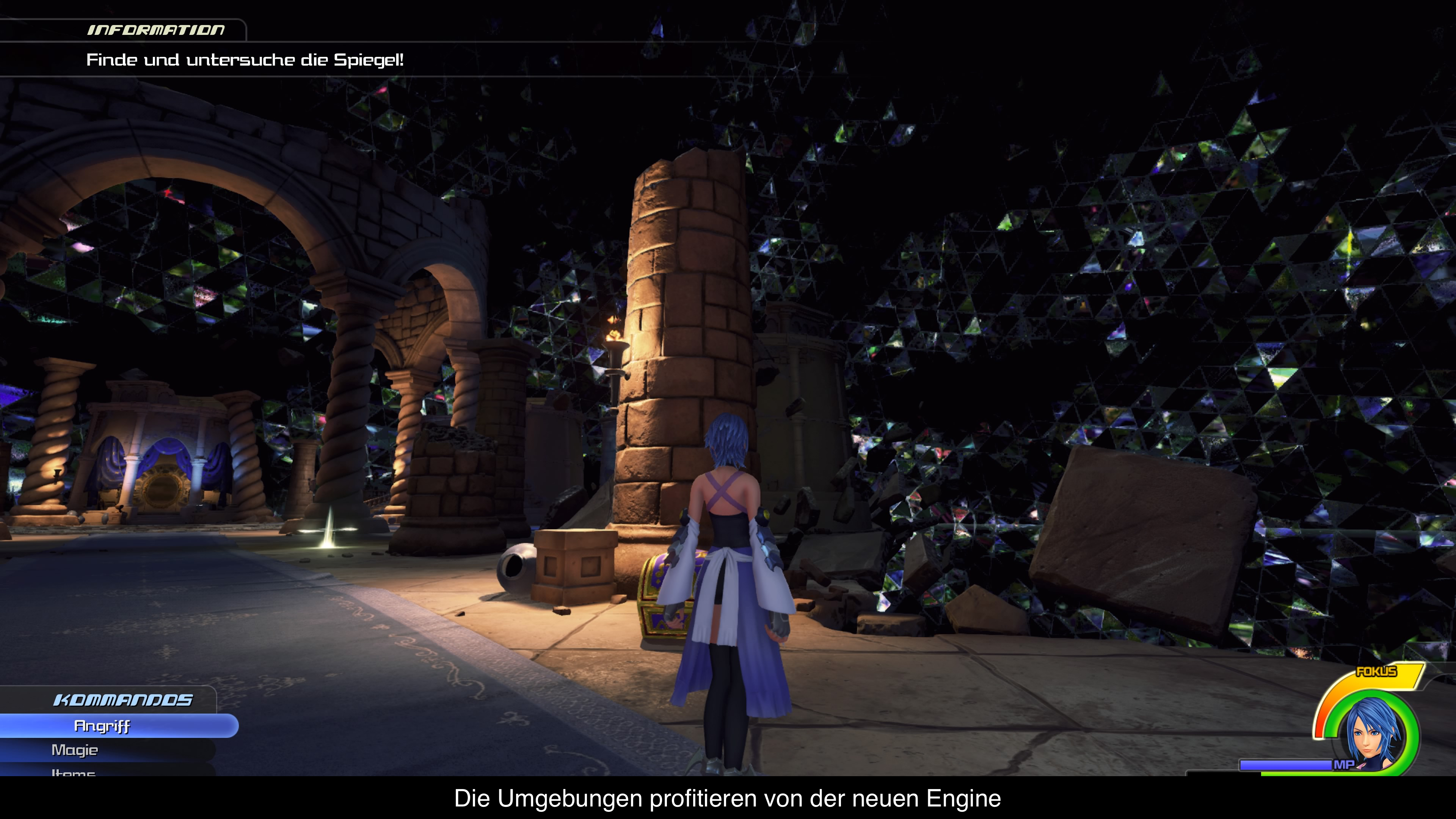 Auch hier gibt es spielerisch wenig überraschendes. Jedoch stellt sich Kingdom Hearts 0.2 Birth by Sleep - A Fragmentary Passte deutlich linearer dar, als andere Spiele der Serie. Es gibt keine unterschiedlichen Welten oder überhaupt größere Interaktionen mit anderen Charakteren und so ist Aqua auf sich allein gestellt, um das Geheimnis der Schattenwelt zu lüften. Dazu beginnt man mit ihr bereits auf Level 50 und hat Zauber, wie Blitzga oder Vigra zur Verfügung, was die Sache etwas einfacher macht. Hier merkt man auch die Neuentwicklung, da sich das Spiel bzw. Gameplay deutlich flüssiger im Kampfablauf anfühlt, als z.B. noch bei Dream Drop Distance. Eine neue Fähigkeit ist der Fokus-Angriff, womit man mehrere Gegner anvisieren kann, um anschließend einen mächtigen Angriff gegen alle auszuführen. Zudem füllt sich beim Kämpfen eine Kombo-Leiste, die je nach Kontext dann eine Spezialfähigkeit freischaltet. So ändert sich dann euer Kampfstil etwas oder aber ihr könnt noch mächtigere Zauber ausführen. Zudem gibt es im Spiel Aufgaben, wie „Besiege 50 Herzlose“, die allesamt Kleidungsstücke für Aqua freischalten, womit ihr ihr Aussehen an eure Wünsche anpassen könnt.
