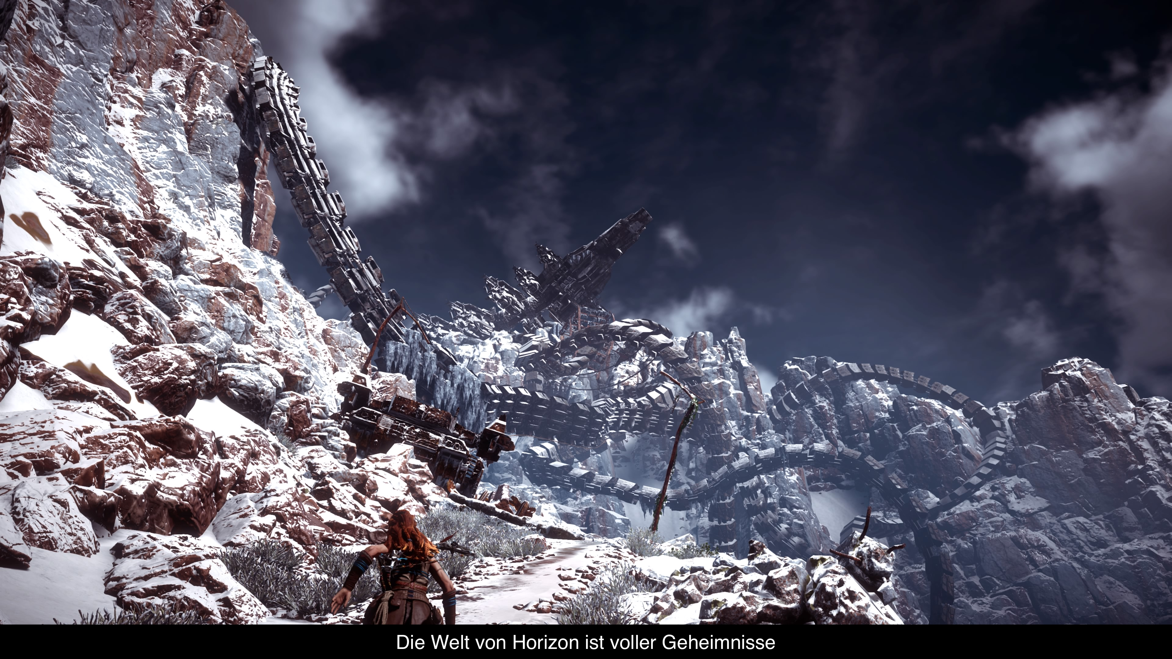 Technisch gehörte Guerilla Games schon immer zu den besten der besten, denn immerhin haben sie den Killzone 2 Teaser am Ende auf der PlayStation 3 zum Laufen bekommen und stellenweise sogar übertroffen und diese Expertise findet man auch in Horizon: Zero Dawn wieder. Das Spiel sieht einfach nur umwerfend aus und kann es problemlos mit Uncharted 4 aufnehmen, bietet dabei aber auch noch eine riesige offene Welt. Sowohl auf der normalen PlayStation 4 als auch der Pro läuft das Spiel mit meist stabilen 30 Bildern pro Sekunde und nur in einzelnen Fällen gibt es mal kleinere Ruckler, die aber nicht wirklich der Rede wert sind. Zudem gibt es tolles Anti-Aliasing, Motion-Blur und auf der Pro sogar eine 4k Ausgabe, die einfach umwerfend aussieht. Außerdem geizt das Spiel nicht gerade mit Effekten, wie Volumetric Lighting oder einigen Alpha-Effekten und hat auch schön hoch aufgelöste Texturen. Insbesondere Kleidungstexturen von z.B. Leder sind wahnsinnig gut geworden. Auch die Weitsicht ist umwerfend und man kann selbst in großer Entfernung noch große Gegner erkennen. Zudem ist die offene Welt wirklich abwechslungsreich gestaltet. Mal gibt es Waldgebiete, dann wieder eine Art Canyon und auch schneebedeckte Berge und all das mit einem dynamischen Tag-/Nachtwechsel und unterschiedlichen Wetterbedingungen. Eine kleine Schwäche gibt es aber noch, die Gesichtsanimationen. Diese wirken nämlich im Vergleich zum Rest etwas schwach und ausdruckslos, zudem fehlt meist die Lippensynchronisation, was etwas befremdlich wirkt.