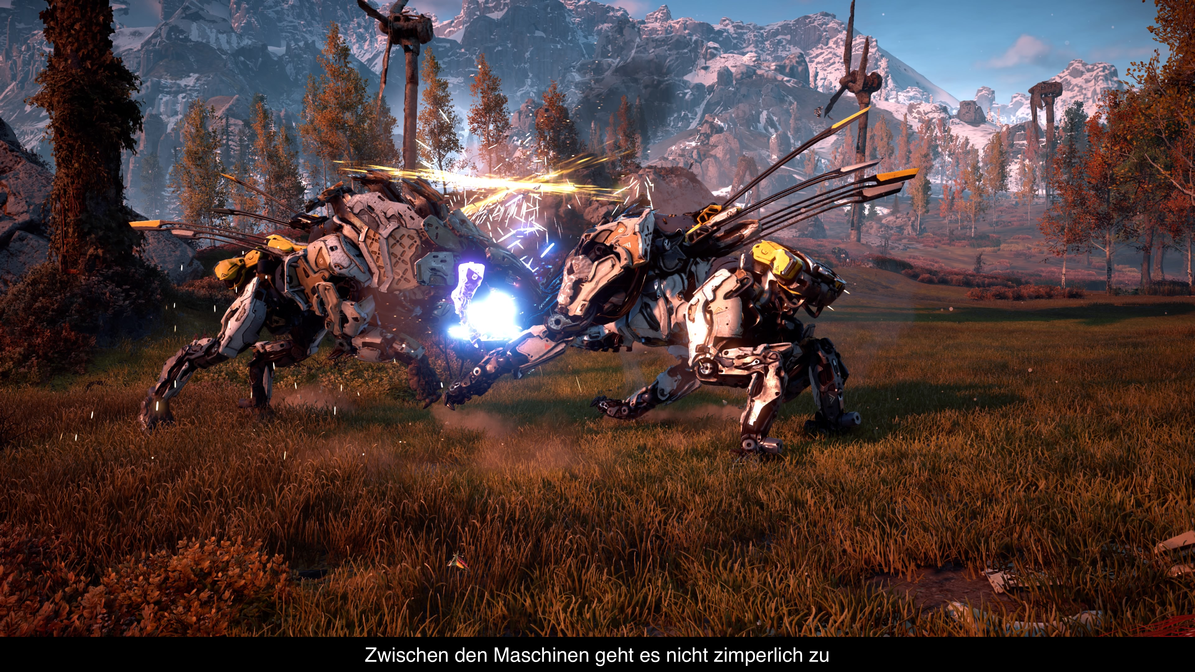 Wie bereits erwähnt, gibt es in der Welt von Horizon: Zero Dawn nicht nur gutmütige Menschen, sondern eben auch die Maschinen, wovon einige ziemlich feindselig sind. Trifft man auf solch eine Maschine ist ein Kampf manchmal unausweichlich, doch Vorbereitung ist hier die halbe Miete. Dazu stehen einem zahlreiche Waffen zur Verfügung, vom Bogen bis zum Stolperdraht, die allesamt noch unterschiedliche Elementarfunktionen bieten. So gibt es zum Beispiel Feuerpfeile oder Stolperdrähte, die entweder explodieren oder den Gegner kurzzeitig betäuben. Das hat auch alles seine Daseinsberechtigung, da die Maschinen unterschiedliche Schwachpunkte haben. Mal ist es ein Treibstofftank auf dem Rücken, den man zur Explosion bringen könnte oder eine gefährliche Waffe, die man schleunigst vom Gegner trennen sollte. Denn vor allem im späteren Spielverlauf geizen die Maschinen nicht gerade mit Feuerkraft. Mit dem richtigen Einsatz der Waffen kann man den Gegner aber stetig schwächen und ihm am Ende den Gnadenstoß versetzen, vielleicht sogar mit seiner eigenen Waffe. Wer sich also vorher über seinen Gegner schlau macht und seine Waffen und die Umgebung klug einsetzt, kann die Kämpfe kurz und einfach halten. Natürlich bekommt man nicht immer die Möglichkeit dazu und manchmal ist etwas mehr Initiative gefragt, aber auch hier macht sich Gegnerkunde bezahlt. Im Ernstfall kann man sich auch im Nahkampf zur Wehr setzen, aber hier sollte man auch etwas Hirn einsetzen. Denn wer einfach nur drauflos schlägt, wird schnell das zeitliche segnen. Die Kunst ist es hier im richtigen Moment die richtigen Schläge zu platzieren und öfters mal auszuweichen. Zeitweise erinnert das schon an die Dark Souls Spiele und macht dementsprechend auch viel Spaß. Einzig der Lock-On fehlt hier, was manchmal für etwas Chaos sorgt. Insgesamt bietet das Spiel unheimlich viele Taktik-Elemente und jeder Kampf gegen eine Maschine ist etwas besonderes und könnte in anderen Spielen ein Bosskampf sein. Die Möglichkeiten sind einfach riesig.