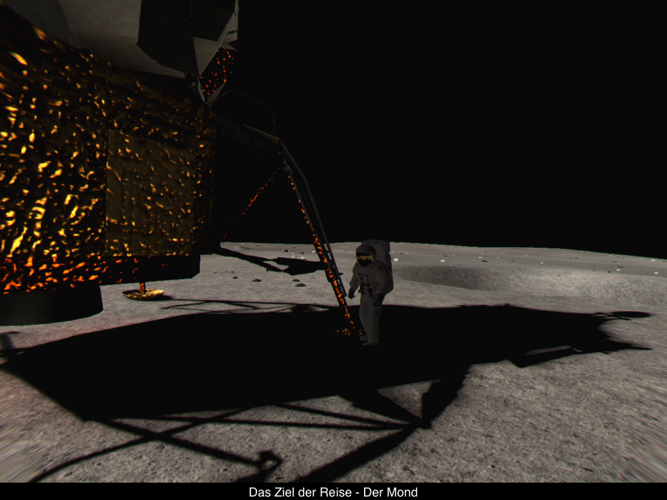 Anschließend werden die wichtigsten Phasen der Mondexpedition in einzelnen Szenen präsentiert. Einige wenige davon sind auf Wunsch interaktiv, aber das meiste davon beschränkt sich auf simple Eingaben. Das bedeutet aber nicht, dass sie sehr einfach sind, denn leider wird nicht so richtig erklärt, was man genau machen soll. Die Landung auf dem Mond habe ich so nicht hinbekommen, weil die Instruktionen zu vage sind, aber da das auch nicht wirklich spaßig ist, hatte ich auch gar keine Lust, es nochmal zu versuchen. Zum Glück kann man jederzeit die Interaktionsmöglichkeiten aus- oder einschalten. Besser war da schon der Spaziergang auf der Oberfläche, wo man ein kleines Areal durchwandern oder – für diejenigen, die das in VR besser vertragen - auch per Teleportation durchqueren kann. Dort kann man sich zu ein paar der Aufbauten auch ein wenig Hintergrundwissen durchlesen oder anhören.