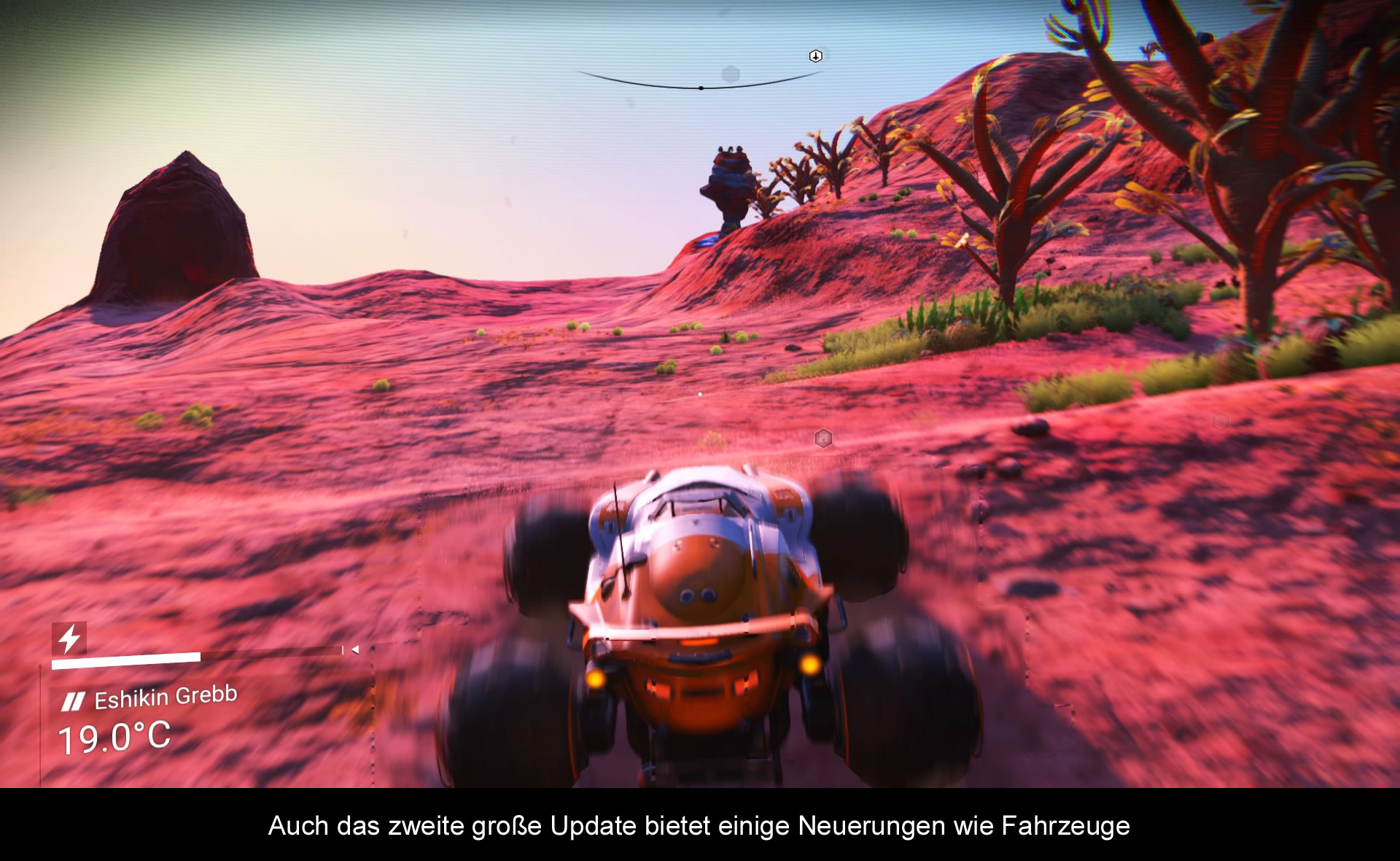 Herzstück des Updates 1.2. sind die neuen Fahrzeuge. Über das Baumenü kann man auf jeden Planeten eine Fahrzeugbucht bauen und einen der drei Exocraft herbeirufen. Der Rover ist der Allrounder. Schnell, zuverlässig und genügend Platz um Material abzubauen. Der Nomad eignet sich für die schnelle Erkundung, hat aber wenig Platz und der mächtige Colossus wiederrum für den Material Abbau, langsam aber viel Stauraum. Wie das Schiff können auch diese Fahrzeuge aufgewertet werden. Neu seit diesem Update sind Naniten. Diese Währung wird nun benötigt um Technologie zu kaufen. Somit kann man gezielt gewünschte Upgrades vom neuen Händler kaufen, statt sie zufällig zu finden. Ebenso wurden nun Multi-Tools wie auch Schiffe in Klassen eingeteilt, damit man schneller die Vorzüge erkennt. Auch gibt es endlich einen Rabatt, wenn man sein altes Schiff oder Waffe eintauscht. Das gesparte Geld kann man danach in die neuen Waffen und Raumschiff Mods stecken, oder für die neuen Gestaltungsoptionen der Basis. Diese ist nun auch online teilbar und kann von jedem besucht werden. Wer will kann nun auch mehrere Raumschiffe besitzen und im Frachter parken. Daneben gibt es kleiner Updates in den Menüs und einen Permadeth Modus. Hier bedeutet Game Over Neustart des Spiels. Der Umfang gegenüber Update 1.1 ist geringer, man hat die Zeit genutzt die Engine ordentlich zu überarbeiten. Neue und bessere Texturen, andere Beleuchtung und Entfernung des ungeliebten Filters! No Mans Sky zeigt sich nun von seiner besten Seite, wobei hier PlayStation 4 Pro Besitzer weiter Vorteile genießen. Neben der HDR Unterstützung gibt es nun auch eine 4K Auflösung und die Framerate Limitierung wurde aufgehoben. Wer will kann das Spiel kann in 4K mit 30-50fps spielen. Empfehlenswert und technisch zu bevorzugen sind aber 1080p mit 60fps. Popups sind in diesem Modus wesentlich erträglicher. Die normale PS4 hat damit weiterhin Probleme besonders, wenn man in einem schnellen Exocraft unterwegs ist. Zu guter Letzt wurde noch ein Fotomodus eingebaut, welcher keine Wünsche offenlässt und das Geschehen eindrucksvoll einfängt.