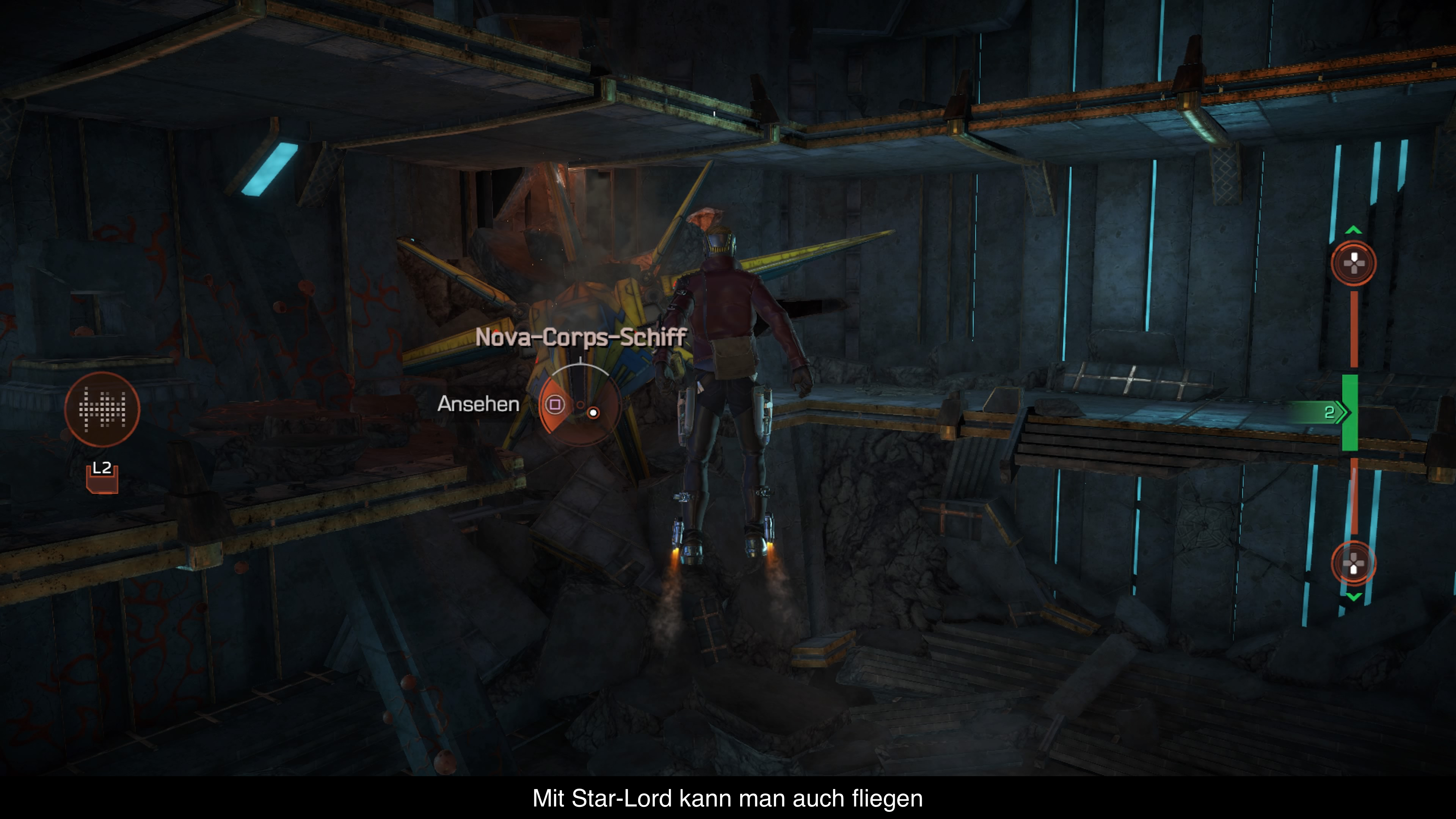 Spielerisch bietet Marvel`s Guardians of the Galaxy kaum etwas neues. Große Teile des Spiels laufen quasi als QTE-Sequenz mit einzelnen Dialogoptionen dazwischen ab. Dadurch sind zumindest die Action-Teile etwas dynamischer und zum Teil auch recht gut in Szene gesetzt. Dazwischen gibt es zwei bis drei ruhigere Parts, wo ihr euch frei bewegen könnt und im Grunde nur mit euren Teampartnern sprechen müsst, um die Geschichte voranzutreiben. Während dieser Szenen habt ihr manchmal die Möglichkeit mit Star-Lord auch zu fliegen. Denn manche Umgebungen bestehen aus mehreren Ebenen, die ihr dann ebenfalls schnell erreichen könnt. Leider funktioniert all das extrem statisch und hakelig. Man kann nicht einfach umherlaufen und per Funk mit seinen Teammitgliedern sprechen und dabei noch die Ebenen wechseln. Es geht nur eins nach dem anderen und wer nicht aufpasst, bricht dadurch auch noch gesprochene Dialoge ab.