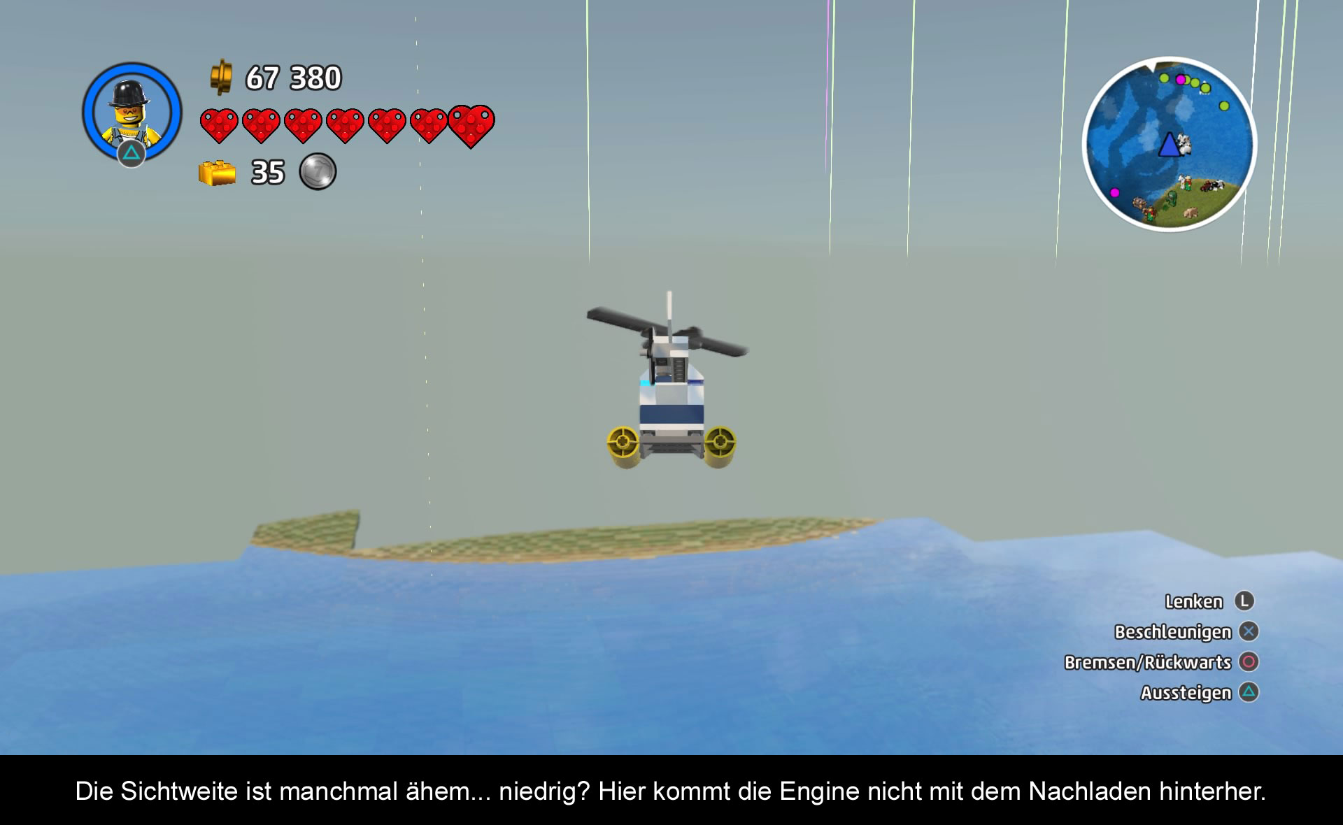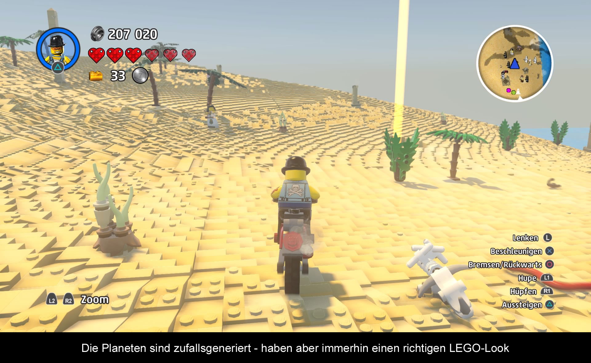 Technisch ist das Spiel sehr interessant. Erstmalig haben die Entwickler ganze LEGO Welten aus LEGO Steinen kreiert. Jedes Set kann in der realen Welt nachgebaut werden. Dadurch ist es möglich, dass man die Welt nach Belieben verändern kann. Ähnlich wie bei No Man’s Sky setzt man auch auf prozedurale Generierung. Alle Themenwelten folgen einem bestimmten Muster und einer bestimmten Logik. Das soll für unendliche Abwechslung sorgen, doch fehlerfrei ist das System leider nicht. Im Laufe der Reiste trifft man immer wieder auf dieselben Landschaften und Objekte. Auch die Mission ändern sich nicht gravierend. Das hier und da ein Charakter ober Objekte seltsam platziert sind, darüber kann man hinwegsehen, über die technischen Schwierigkeiten aber nicht. Die Sichtweite im Spiel ist zum Beispiel stark eingeschränkt und es braucht einige Zeit, die Welt vor einem zu Generieren. Ist man mit einem Fahrzeug unterwegs, steht man öfters vor einem leeren Feld und die Landschaft baut sich langsam vor einem auf. Auch der Wechsel zwischen einer Welt zur Nächsten dauert eine Ewigkeit, besonders wenn man diese schon selbst ummodeliert hat. Neben der technischen Limitierung kommen noch Framerateprobleme dazu. Bei jedem größeren Nachladen ruckelt das Spiel und braucht seine Zeit, um wieder in Schwung zu kommen. Schaltet man hier noch auf den lokalen Zweispielermodus um, scheint die Engine an ihr Limit zu kommen. In Anbetracht des Umfangs, kann man das noch Verschmerzen, doch die vielen Bugs dafür nicht! Es scheint, als hätte man das Qualitätsmanagment komplett außen vorgelassen. KI Aussetzer und die Wegfindung sind kleiner Probleme, aber was macht man, wenn die Spielfigur einfriert? Es kann vorkommen, dass sich diese nicht mehr steuern lässt, die Objekte nicht wechseln oder man einfach in der Ego-Perspektive festhängt. Viele der Bugs lassen sich nur mit einem Neustart beheben, bei manchen reicht es auch aus, einfach neu in die Welt abzuspringen. Der gefährlichste Bug bleibt aber der korrupte Spielstand. Ohne Vorwarnung kann das Savegame gelöscht werden und man darf wieder von vorne begonnen werden!