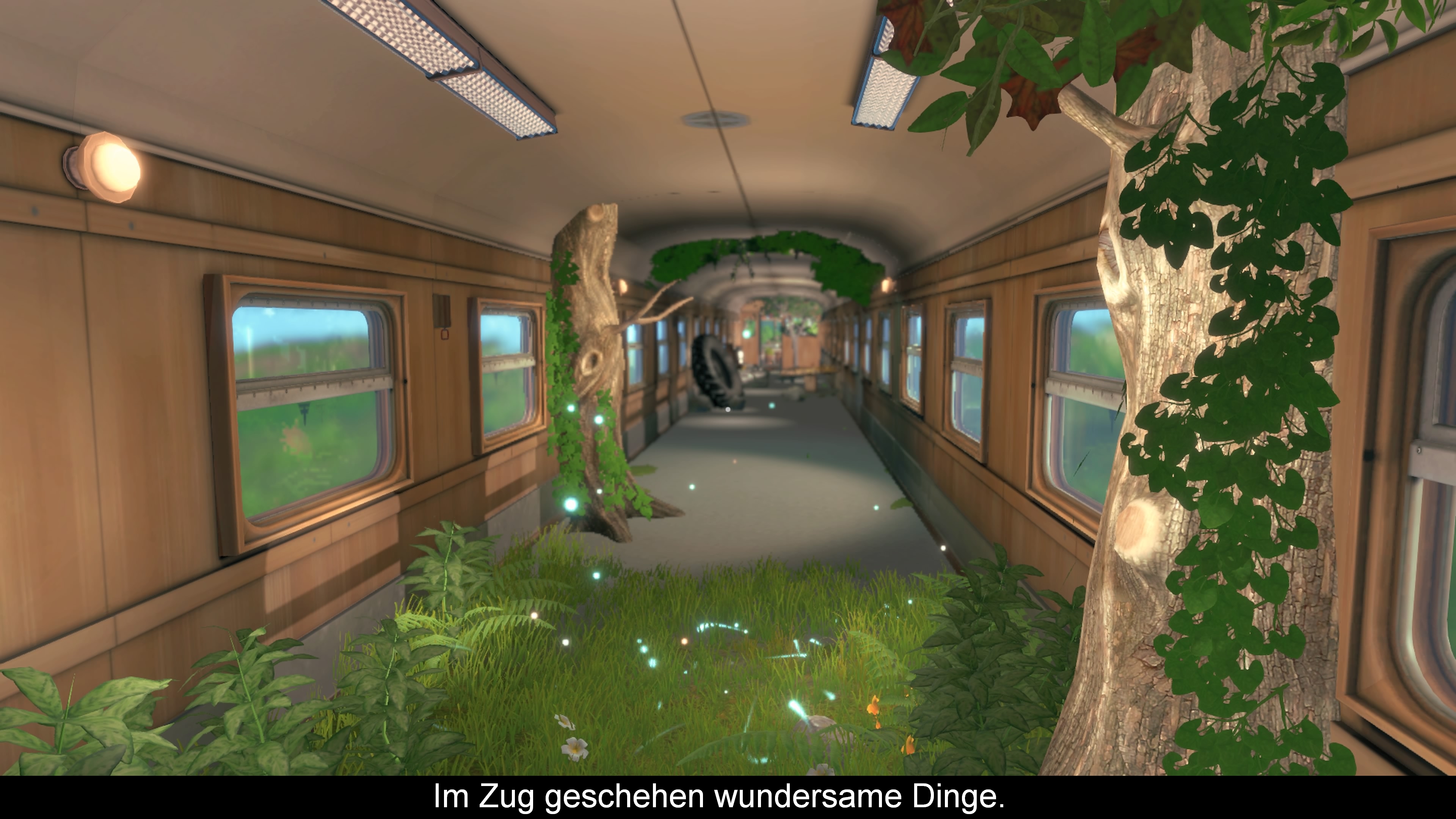 Wo bin ich? So langsam wache ich auf und schaue mich um. Ich scheine in einem Zug zu sitzen, doch warum? Ich, Scarlett, höre in der Ferne die Stimme meines kleinen Bruders Finn, welcher wohl in Schwierigkeiten zu stecken scheint und meine Hilfe benötigt. Nachdem ich Finn gefunden habe, versuche ich Antworten auf meine Fragen zu finden, denn eines wird mir schnell klar. Der Zug fährt nicht durch die reale Welt, da dieser erstens nur mit meiner Familie und Freunden besetzt ist und zweitens diese Masken aufhaben. Zusätzlich befindet sich noch ein Junge im Matrosenanzug und Hasenkopf im Zug. Zudem hängen in den Abteilen bekannte Filmposter mit Finn der Hauptrolle. Um mehr zu erfahren höre ich mir an, was die starr stehenden und sitzenden Charaktere mir zu sagen haben. Anfangs klingen die Monologe vielleicht noch wirr, doch nachdem man die Charaktere Paarweise zusammengefügt hat und immer mehr über die Hintergründe erfährt, lichtet sich so langsam die Geschichte. Das geniale dabei ist, dass die Geschichte mir nicht im klassischen Sinn erzählt wird, sondern man mehr und mehr über die Charaktere und ihr Leben herausfindet und sich so alles zusammensetzt.