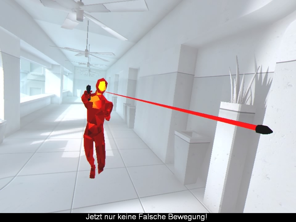 Ursprünglich handelt es sich bei “Superhot” um ein Flash Game, welches 2013 bei einer sieben Tage Challenge programmiert wurde. Der Kniff bei dem Spiel lag darin, dass sich die Gegner nur bewegten, wenn man sich selbst bewegt hat. Dieses grundlegende Spielkonzept hat man in der nun veröffentlichten VR Version zwar beibehalten, doch das restliche Spiel komplett umgekrempelt. Die Bewegungen der Gegner passen sich dabei genau der eigenen Geschwindigkeit an und stoppen, wenn man selbst regungslos bleibt. Somit hat man die volle Kontrolle über die Spielgeschwindigkeit und kann seine nächsten Aktionen genau planen, was dem Titel eine ziemliche Tiefe verleiht und man sich gewisse Strategien zurechtlegen muss. Ganz nebenbei schaut das Ganze dadurch extrem stylisch aus und man fühlt sich wie Neo aus dem Film “Matrix”.