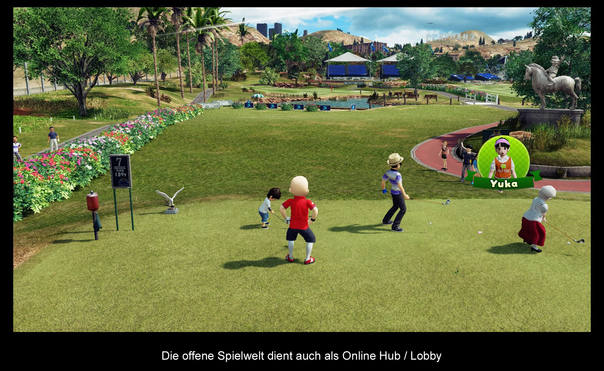 Okay, Everybody's Golf hat zwar den Schritt in Richtung Open World gewagt, aber dennoch ist es nicht ganz so vollgepackt mit Inhalten, wie zum Beispiel ein GTA. Dennoch gibt es in der Welt von Everybody's Golf sehr viel Neues zu erleben, dazu zählt unter anderem die Möglichkeit, an Bächen und Seen Fischen zu gehen. Laut den Entwicklern wurde man hierbei von Golfkursen aus dem echten Leben inspiriert, die eine ähnliche Erfahrung bieten. Der Umfang dieses Minispiels ist mit einem imposanten Inventar, einer Fisch-Enzyklopädie und sogar einem eigenen Level-System überraschend groß ausgefallen. Einzig und allein das Gameplay, welches Button-Mashing in den Vordergrund stellt, wird im Zuge der Zeit etwas eintönig. Wer jedoch eine kleine Alternative zum Golfsport sucht, wird hier definitiv gut unterhalten werden. Eine weitere Neuerung, die ebenfalls im Bezug zur offenen Welt steht, ist das neue Golfmobil mit dem ihr euch noch schneller durch die großen Karten bewegen könnt. All dies ist Teil der neuen offenen Gameplay-Welt, die ihr nur erkunden könnt, wenn ihr online seid. Zusätzlich zu den zuvor erwähnten Features, gibt es auch einige neue Modi, auf die man online zugreifen kann. So ist der Online-Modus in zwei Modi unterteilt: Zum einem gibt es da die offene Welt, wo man entweder alleine oder mit Freunden um Siege und Leaderboard-Platzierungen (für die man mit Preisen belohnt wird) spielen kann, und zum anderen gibt es da noch den neuen „Turf War“-Modus, wo zwei Gruppen darum spielen, innerhalb kurzer Zeit, die meisten Punkte zu erzielen. Zu guter Letzt bietet die offene Welt auch noch zahlreiche Geheimnisse und Preise, die man in den Level finden kann, was einem ebenfalls dazu anregt, die Welt zu erforschen. Und da man gleichzeitig auch die anderen Spieler sieht, die gerade online sind, herrscht stets ein munteres, aber keineswegs nerviges Treiben auf dem Grün. Alles in allem ist der neue Fokus auf die Online-Anbindung eine gelungene Addition, die die Serie nochmals auf eine ganz neue Stufe bringt.