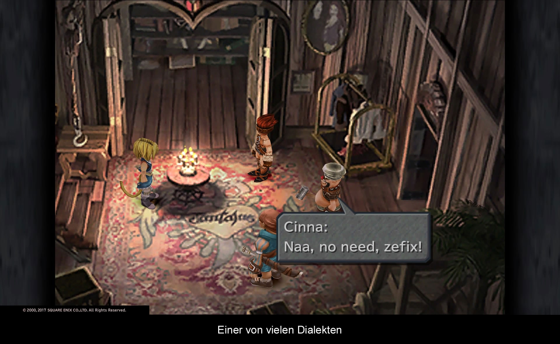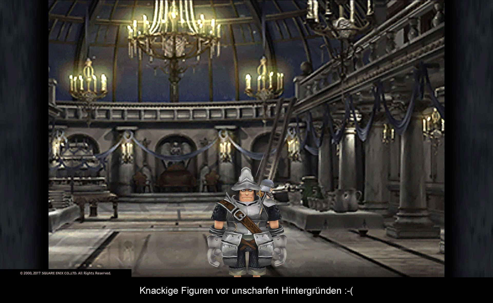 ...war Final Fantasy IX definitiv ein Glanzpunkt in Sachen Lokalisierung. Zwar gibt es keine Sprachausgabe, doch hat man die Texte passend übersetzt. Alle Charaktere haben einen gewissen Dialekt und eine einzigartige Redensart. Garnet ist höflich förmlich, Zidane der Freche und Steiner spricht Vivi steht’s mit Meister an. Dies beschränkt sich nicht nur auf die Hauptfiguren, sondern auch auf viele Nebencharaktere. Selbst heutzutage ist das eine Seltenheit und macht das Spiel zu einem kleinen Unikat. Es wäre schön, wenn man dasselbe auch über die Präsentation sagen könnte. Square Enix hat allen Charaktere eine HD-Kur verordnet, wodurch endlich die kleinen und feinen Details erkennbar sind. Auch die Gegner wurden an die heutigen Auflösungen angepasst, genauso wie die vielen – immer noch hübschen Rendervideos auf 1080p hochgerechnet wurden. Der Haken an der Sache ist: Das steht alles im harten Kontrast zu den Hintergrundbildern. Die alten vorgerenderten Umgebungen wurden lediglich hochskaliert, wodurch diese verwaschen und unscharf wirken. Es dauert einige Zeit sich daran zu gewöhnen, ein Ärgernis bleibt es trotzdem. Dafür klingt die Musik besser als jemals zuvor (Anm. d. Red.: Ein kleiner Trost…).