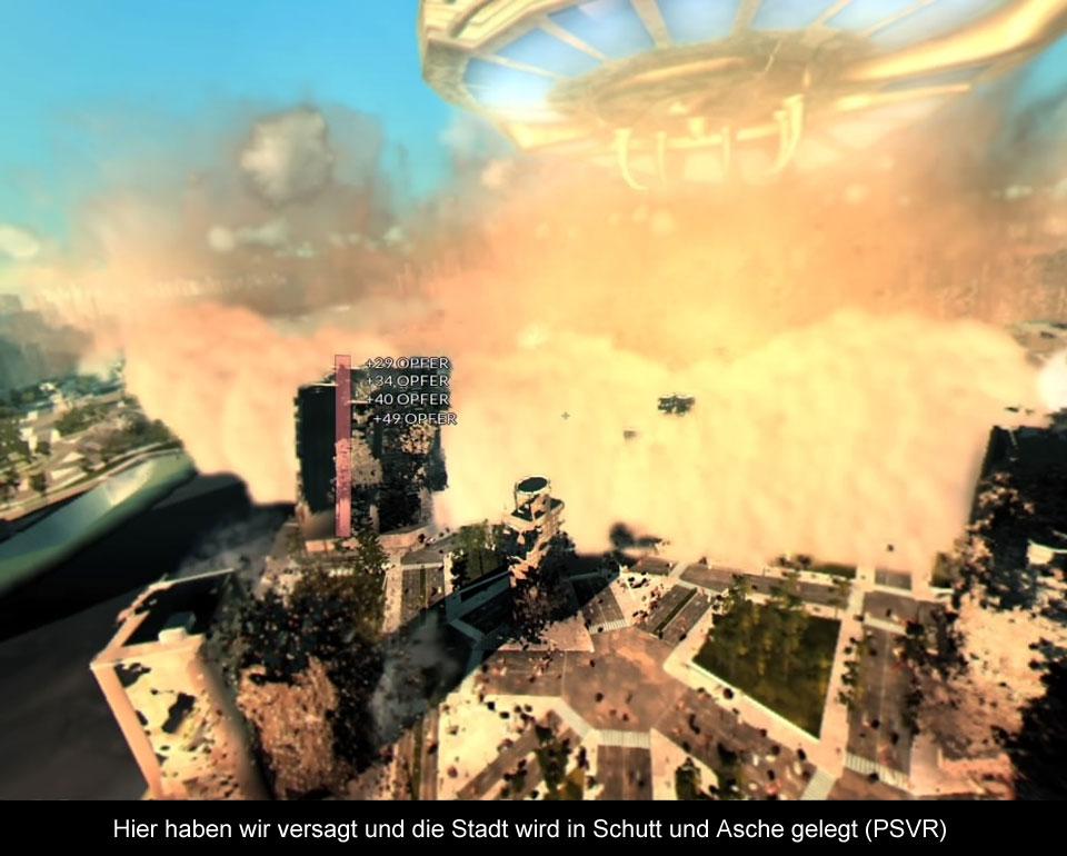 Wie bereits weiter oben erwähnt, ist die Technik etwas zwiespältig und ab und an ein klein wenig buggy. Die Städte schauen an sich sehr beeindruckend aus und warten nicht nur mit belebten Straßen auf, sondern bieten auch gewaltige Skylines und schöne Lichteffekte. Aber auch kleinere Städte ohne Skylines gibt es zu entdecken. Bei genauerem Hinsehen, fällt einem die limitierte Hardware der Playstation 4 Pro und der Playstation VR jedoch immer wieder auf. So ist nur ein kleiner Teil in der Mitte knackscharf, während die restliche Schärfe im Randbereich stark abfällt. Auch verlaufen Straßen schon mal im Sande oder eine Skyline schwebt über dem Boden und Texturen und Details werden sehr spät nachgeladen. Hinzu kommt, dass außerhalb der Städte alles recht karg daherkommt und man nur wenige kleine Wälder und keinerlei Tiere sieht. Einzig unter Wasser kann schon mal ein kleiner Schwarm Fische an einem vorbeischwimmen. Nach einem ersten Patch hat sich die Situation zwar etwas gebessert, dennoch merkt man, dass die Konsole hier an ihre Grenzen kommt. Immerhin läuft das Geschehen stets mit 60 Bildern die Sekunde flüssig. Wie schon bei “DriveClub” ist aufgrund der geringen Schärfe auch die Motion Sickness Gefahr bei “Megaton Rainfall” sehr ausgeprägt. Als ich das Spiel das erste Mal startete, wurde mir nach einer halben Stunde extrem übel und der Tag war für mich inkl. Schüttelfrostanfällen gelaufen. Zum Glück kann man etliche optische Hilfen zuschalten (Sichtfeldverengung bei zu schneller Action, stufenweises drehen beim Umschauen), um den Effekt der Motion Sickness einzudämmen und der nächste Rundflug verlief knappe 4h ohne das mir schlecht wurde. Wer keine Playstation VR zu Hause hat, kann “Megaton Rainfall” aber auch ohne spielen (mittels PS4pro und entsprechendem TV auch in 4K). Hier funktioniert das Nachladen um einiges besser, was vor allem beim Landen auf anderen Planeten auffällt. Dank besserer Schärfe ist die Übersicht ohne VR ebenfalls besser, aber auch weit weniger intensiv und beeindruckend. Akustisch gibt es jedoch nicht so viel Aufregendes zu berichten und eine musikalische Untermalung fehlt fast komplett. Zwar klingen die Explosionen, das Geschrei der Menschen und allgemeine Umgebungsgeräusche ganz gut, doch ein durchgängiger Soundtrack wäre vor allem während der Missionen nett gewesen. Nur selten kommt es nämlich zu treibender Musik und auch mal schönen Gesang.
