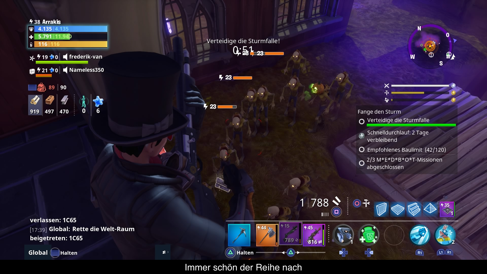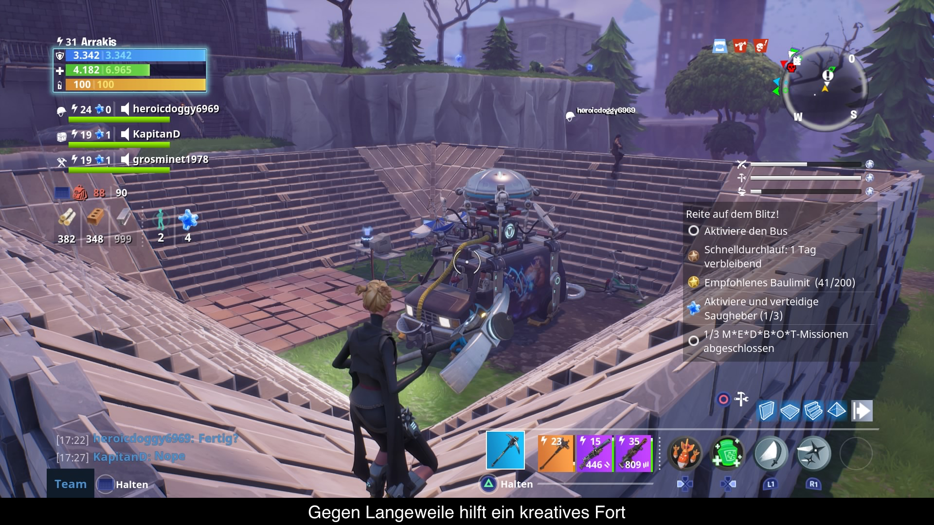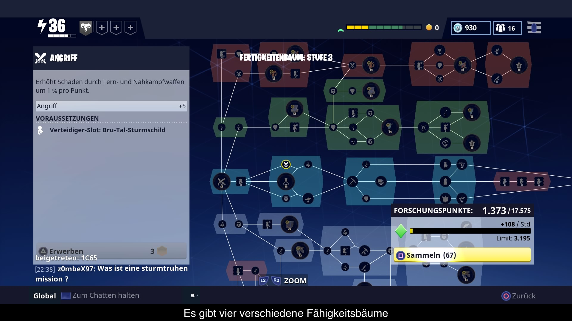 Wer Fortnite das erste Mal startet wird von einer Vielzahl von Menüs erschlagen. Wähle deinen Helden, wähle eine Mission, teile Verteidiger zu, teile deine Unterstützer zu, erhöhe das Waffenlevel usw. Die Optionen sind mannigfaltig und schlecht erklärt. Um das Menü Konzept am leichtesten zu begreifen, stelle man sich eine Level-Up-Spirale vor. Egal was man vom Spiel erhält, ob Verteidiger, Überlebende, Waffen oder Helden, alle wollen aufgelevelt werden. Nur wer hier regelmäßig Erfahrungspunkte investiert, schaltet gewisse Bonuseigenschaften frei. Im Fall von Überlebenden gibt es mehr Bonuspunkte, wenn man der Gruppe den richtigen Anführer zuweist und bei gleichen Eigenschaften bekommt man mehr Schild, Leben oder Schaden. Helden schalten auf gewissen Level besondere Fähigkeiten und Boni frei. Verteidiger hingegen Boni, welchen dem Helden wieder zugutekommen. Waffen und Fallen bekommen so Elementschäden, mehr Haltbarkeit usw. Natürlich steigen nicht nur die Einheiten, sondern auch die Basis. Mit jeder erfüllten Mission gibt es Erfahrungspunkte welche im Fähigkeitsbaum investiert werden können. Hier schaltet man höhere Waffenlevel, Gadgets, Platzbedarf usw. frei. Daneben gibt es noch Forschungspunkte welche stündlich gesammelt werden um Attribute zu erhöhen. Wer jetzt noch nicht den Überblick verloren hat, der kann sich noch mit dem Sammelalbum beschäftigen und überlegen, ob man Skizzen hier einträgt oder lieber zerlegt um wertvolle Erfahrungspunkte und Level-Up Items zu erhalten. Natürlich ist dies nicht nur auf Waffen beschränkt, sondern auch auf Fallen, Helden, Verteidiger und Überlebenden. Oder man levelt doch lieber das Sammelbuch auf um mehr Bonus Items freizuschalten. Immer noch nicht den Überblick verloren? Sehr gut, denn Besser wird es auch im Spiel nicht erklärt. Trotz allem ist diese Spirale sehr motivierend und nach ein paar Stunden Spielzeit macht es klick und alles ergibt Sinn!