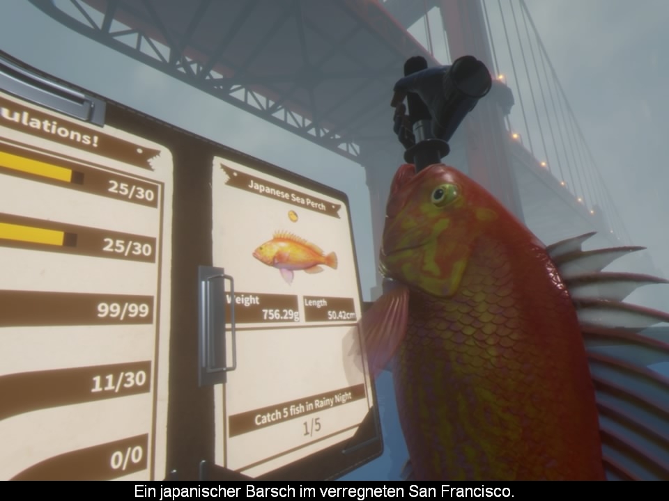 Nach einem kurzen und leicht verständlichen Tutorial sitzt man auch schon bei entspannter Musik auf dem Bug seiner Yacht bei Sonnenuntergang unter der imposanten Golden Gate Bridge und wirft mit einer lockeren Handbewegung mittels Move Controller seine Angel aus. Im Gegensatz zum echten Angeln, braucht man hier allerdings nur wenig Geduld zu haben, da die Fische anbeißen, als ob es kein Morgen gibt. So dauert es nur wenige Sekunden, bis ein Fisch am Haken hängt. Nun noch ein kleiner wink mit der Angel in die angezeigte Richtung und der Lebenskampf kann beginnen! Nun führt man das aus, was einem im Tutorial beigebracht wurde. Schwimmt der Fisch nach links, reißt man die Angel nach rechts, respektive anders herum. Gleichzeitig drückt man den T-Button, was der Angelrolle entspricht, um die Leine einzuholen und den Fisch zu schwächen. Leuchtet die Anzeige der Spannung der Angelschnur rot, heißt es locker lassen, da sonst die Gefahr besteht, dass die Schnur reißt und der Fang flöten geht. Ein locker lassen und strafen der Leine mittels Angelrute funktioniert hier allerdings nicht, was das Mittendrin Gefühl ziemlich stört. Schnell merkt man zudem, dass das nach links und rechts reißen der Angel ebenfalls völlig egal ist, was das ganze ziemlich repetitiv macht. So besteht der Sinn letztendlich nur darin, immer den T-Button zu betätigen und loszulassen, bis der Brocken auf der Yacht zappelt.