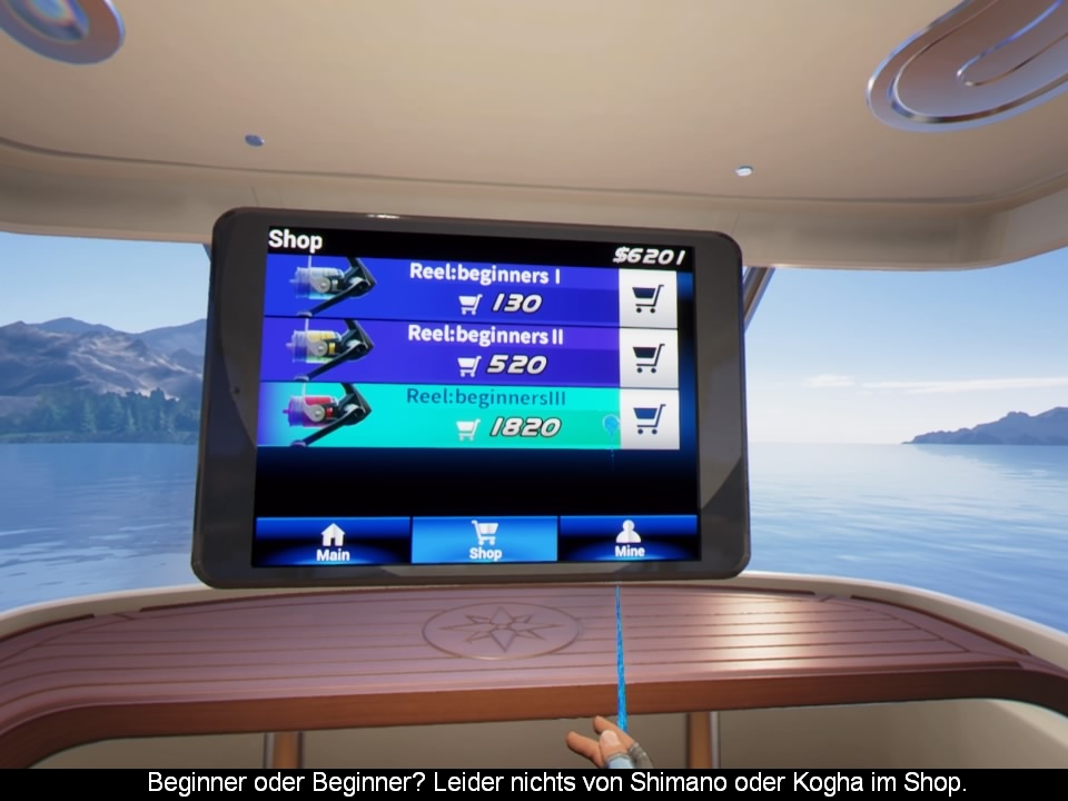 Hinzu kommt, dass es keinerlei verschiedene Strategien für die jeweiligen Fische gibt und es einzig und allein auf die Wertigkeit des Equipments ankommt. So beißen zwar auch große Brocken bei kleinen Ködern an, doch lassen sich solche Fische nicht an Deck holen. Ich verbrachte mit solchen einen Kampf über 10 Minuten, doch der Fisch verblieb auf der gleichen Linie am Horizont. Irgendwann hat man da keine Lust mehr und provoziert absichtlich ein reißen der Schnur. Mit einem Stufe 3 Equipment (Angel, Rolle, Schnur) war der Fang allerdings kein Problem mehr, obwohl man nichts anderes gemacht hat. Apropos Equipment. Bei “Fishing Master” gibt es keinerlei lizenziertes Zubehör und das Equipment unterscheidet sich ausschließlich in entsprechende Stufen. Man kann also nicht zwischen Wobblern, Spinner, Blinkern und so weiter wählen. Das gleiche gilt für Ruten, Rollen und Schnüre. Spinnrute oder Fliegenrute? Baitcaster- oder Centrepin-Rolle? Geflochtene oder Monofile Schnüre? Eine solche Unterteilung findet nicht statt, was zusammen mit dem eintönigen Gameplay für wenig Abwechslung sorgt. Sprich mit der ein und derselben Ausrüstung kann man alle Arten von Fischen fangen. Klar, “Fishing Master” ist ein reines Arcade Spiel, dennoch wäre etwas mehr differenziertes Equipment und somit abwechslungsreiches Gameplay ein Muss gewesen. Nicht einmal mit dem Köder kann man spielen, geschweige denn durch Bestimmung der Wurfkraft die Entfernung des Wurfes beeinflussen.