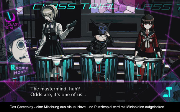 Spielerisch ist die Visual Novel weiterhin als eine Art Point and Click Adventure aufgebaut in der man vielen, sehr vielen Dialogen zuhören wird. Dabei beginnt jedes Kapitel damit, dass man sich erst mal mit der Schule vertraut macht und einfach Zeit mit den anderen Schülern verbringt. Man lernt sie besser kennen und schreitet so in der Geschichte voran. Irgendwann kommt es zu einem Mord und nun müsst ihr Hinweise sammeln. Denn anschließend gibt es immer eine Gerichtsverhandlung in der ihr mit den vorher gesammelten Hinweisen den Mörder überführen musst. Bis zur Gerichtsverhandlung ist das Spiel sehr vorhersehbar und recht eintönig. Während der Gerichtsverhandlung muss man aber nachdenken und die Hinweise gekonnt zusammensetzen, um den Mörder zu überführen. Leider ist das nicht alles, denn das Spiel versucht euch mit allerlei Minispielen das Leben schwer zu machen, was nur für unnötigen Frust sorgt. Statt sich auf die Lösung des Rätsels zu konzentrieren, kämpft man also mit der Steuerung oder nicht immer offensichtlichen Lösungswegen.
